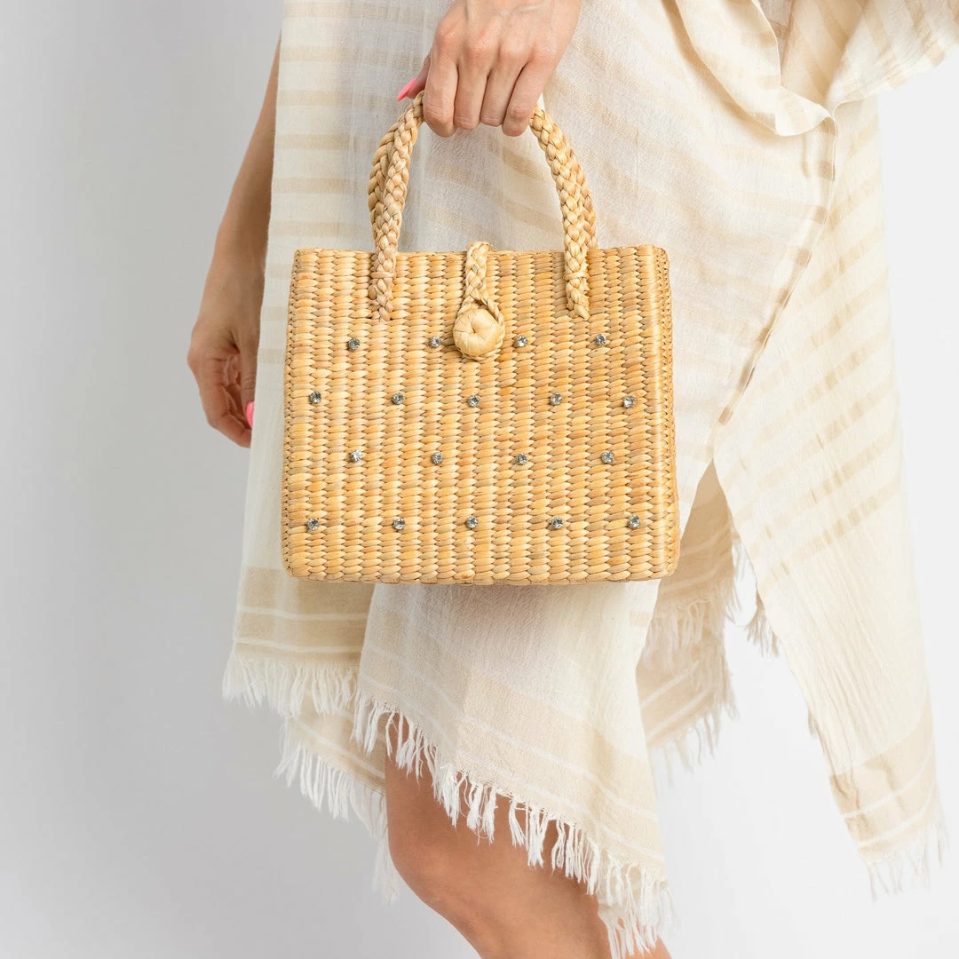 Natural color summer bag with a loop closure. The cutest bag with crystal details for summertime fun!