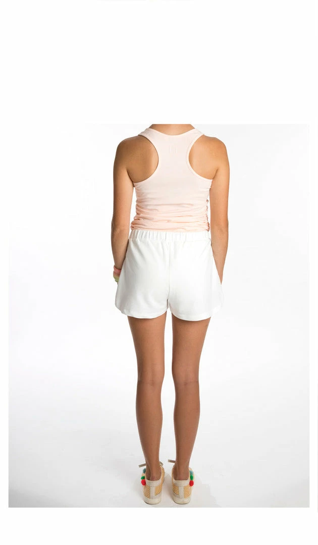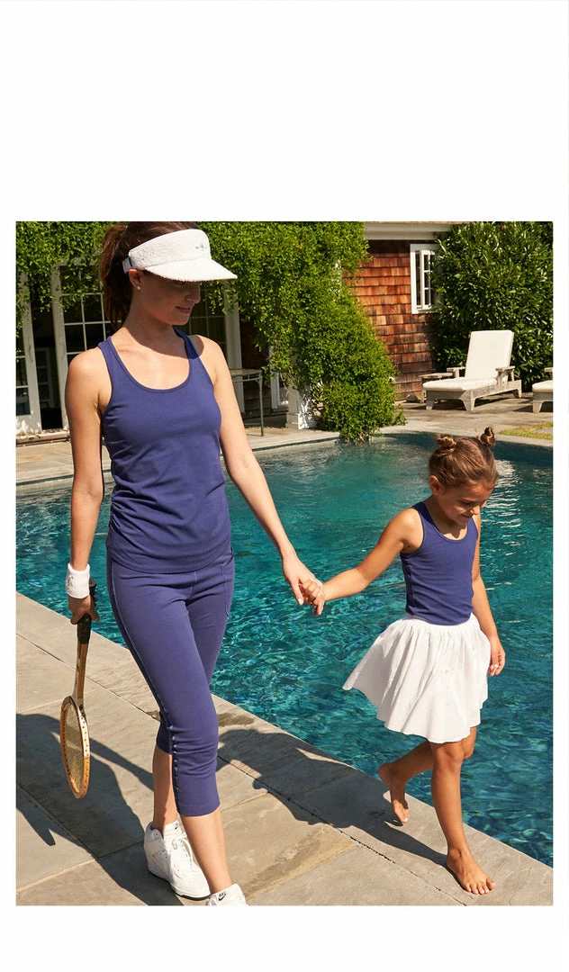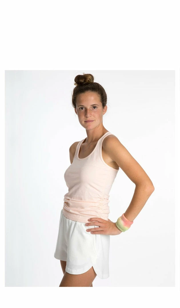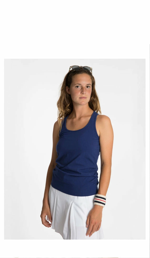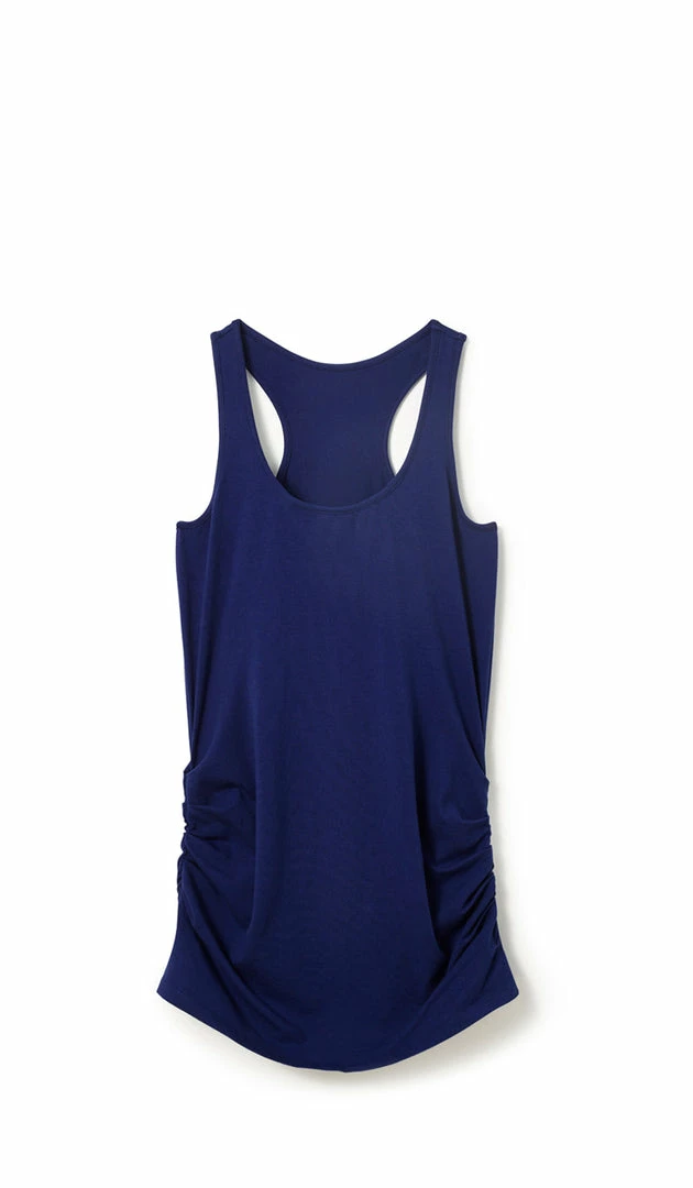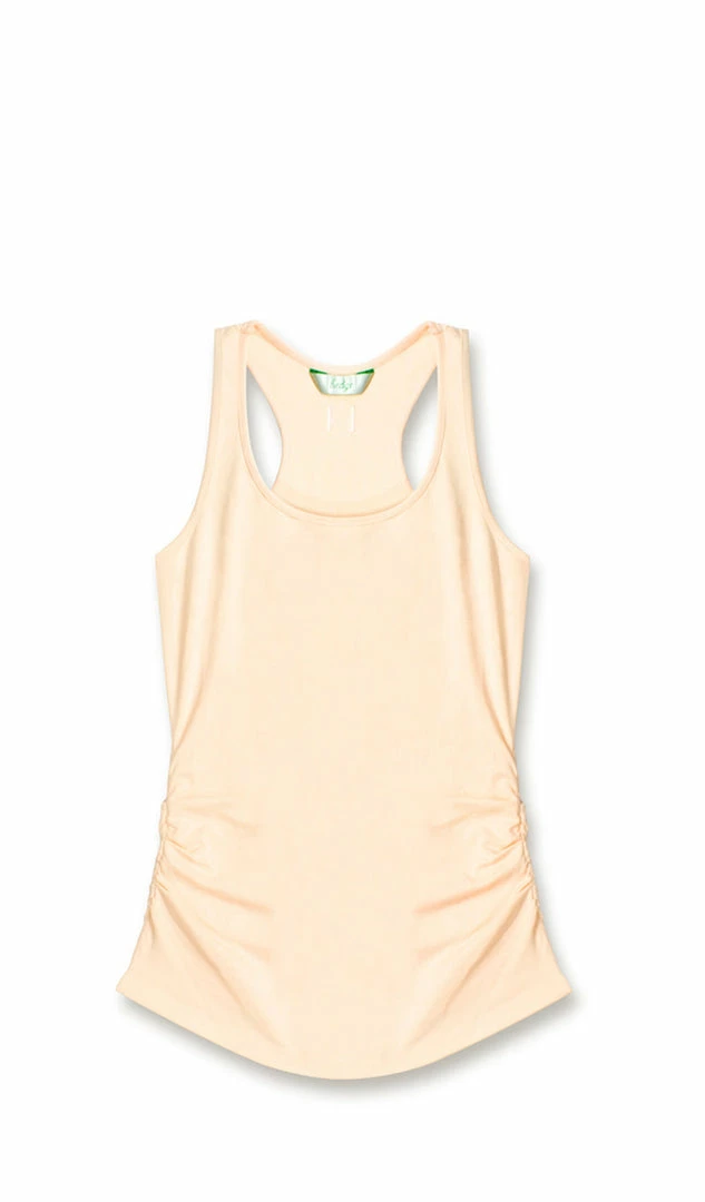 This tank is made with the softest cotton jersey and a healthy coating of SPF. It has a touch of ruching along the sides to hide any imperfections. Racer back style between the shoulder blades ergonomically allows for freedom of movement and beautifully frames your shoulders and back.