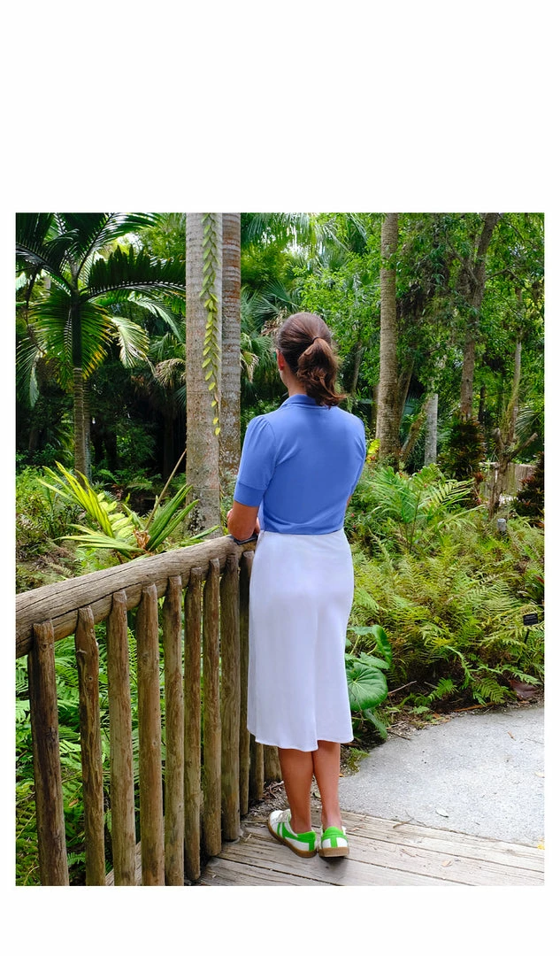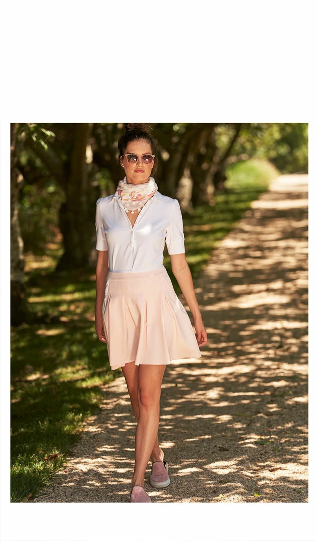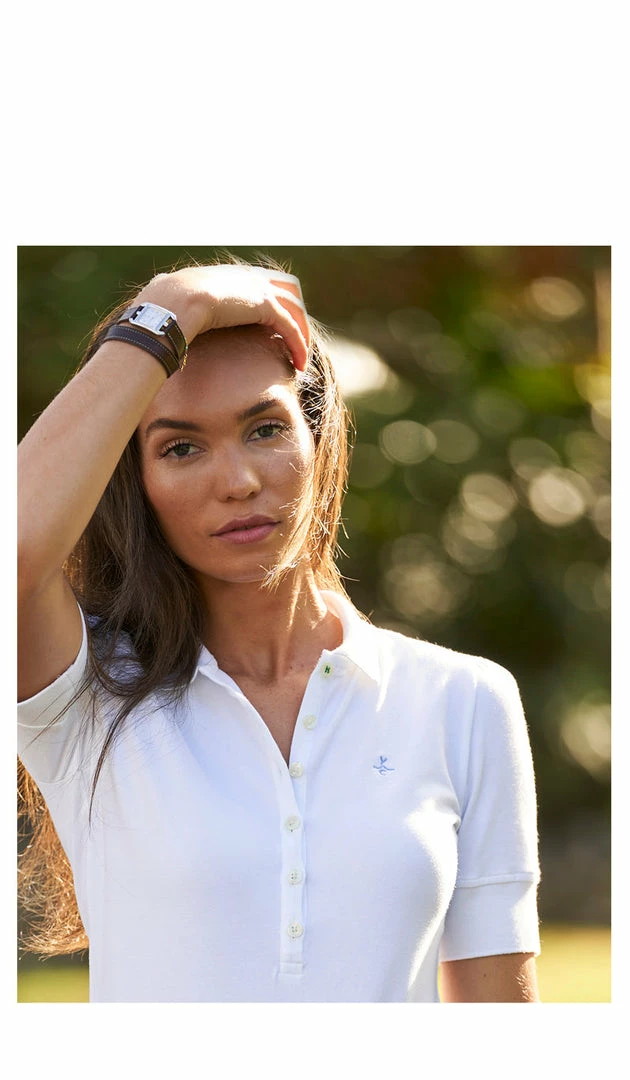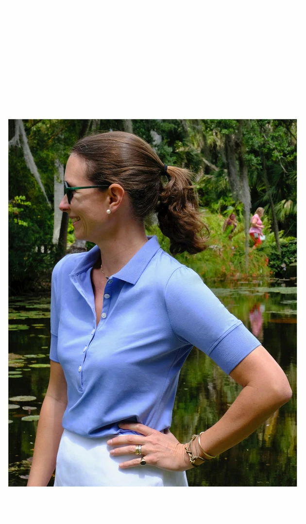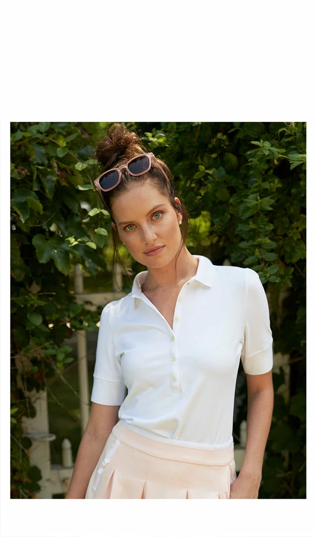 The softest, most elegant polo created thus far. The Sable has an extended narrow placard with petite buttons. The Juliette has longer sleeves than your average polo and a lengthened cuff which visually and functionally slims the arm. The Sable silhouette is fitted with an hourglass shape for femininity unlike all the boxy polos you’ve had. This promises to be a shirt you want to live in, play in all while looking glamorous.