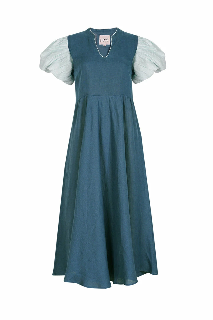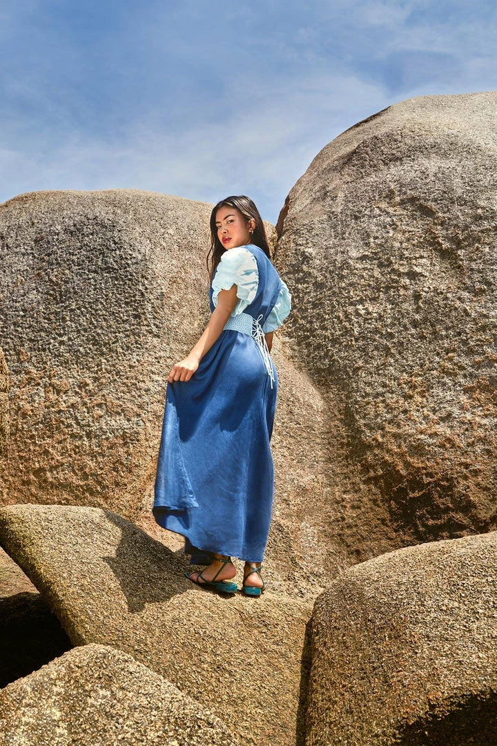 Designed with the notion of easy elegance and an 80’s twist, our Alaya Linen Dress is a midi silhouette with flowy A-line cut and contrasting accents, crafted from 6 meters of pure linen in shades of blue.