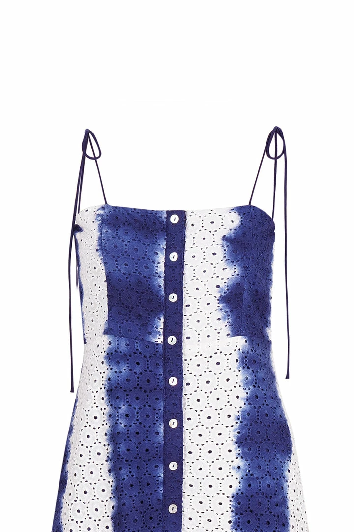 The Marbella Tiered Dress is a midi silhouette with tiered hem and straight neckline adorned with thin straps. Crafted from pure cotton broderie anglaise, this design is hand-dyed in Jaipur using a traditional technique called shibori.Â