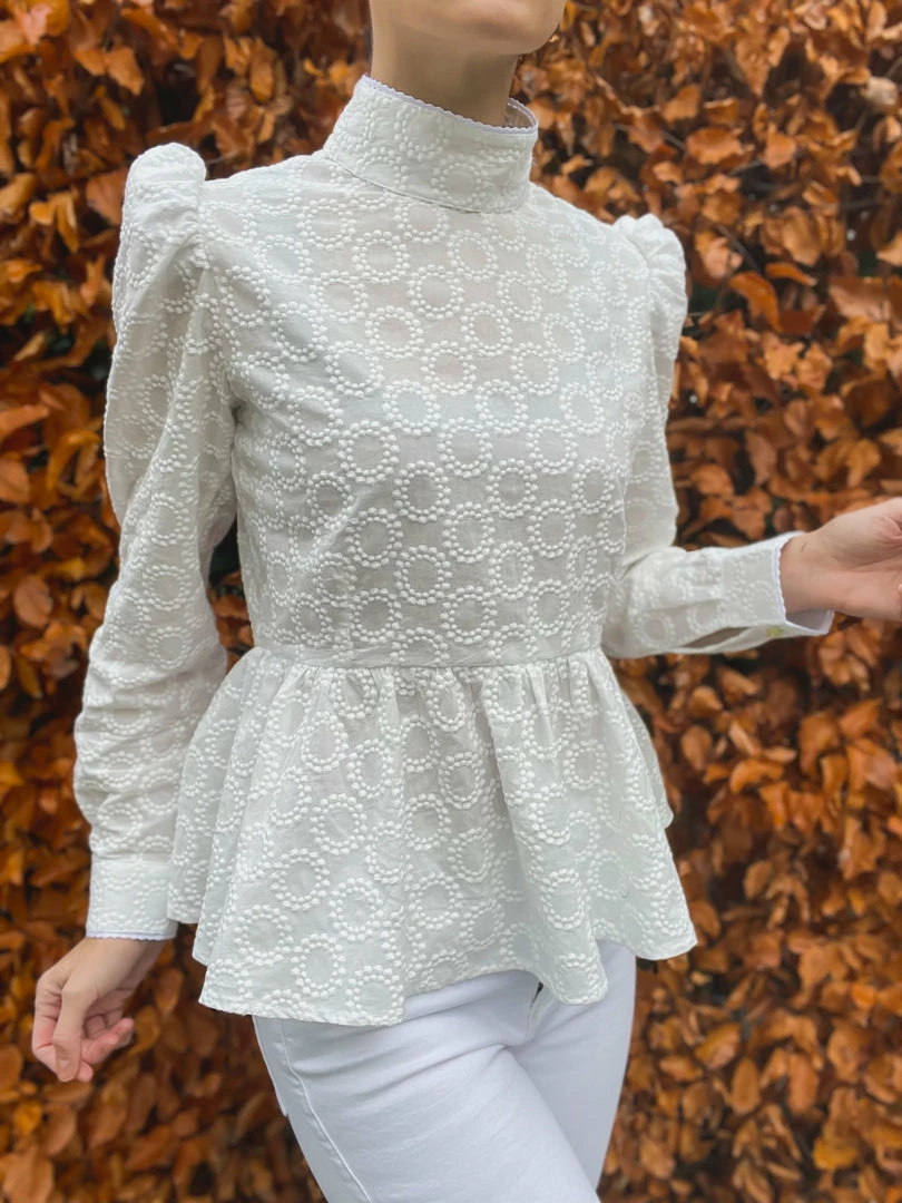 The Marie Blouse, is a timeless classic who will follow you through seasons and styles. Handmade in Germany with the finest french broderies anglaise fabric. 100% Cotton with Oeco-Tex certification. A high-neck collar and a flounce on the bottom for a flattering fit. On the back you have a zip for a easy wear. For pre-order only (takes about 2 weeks)