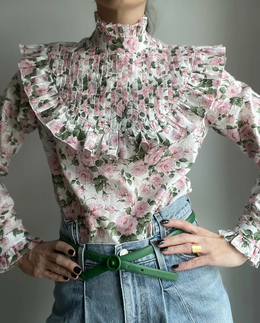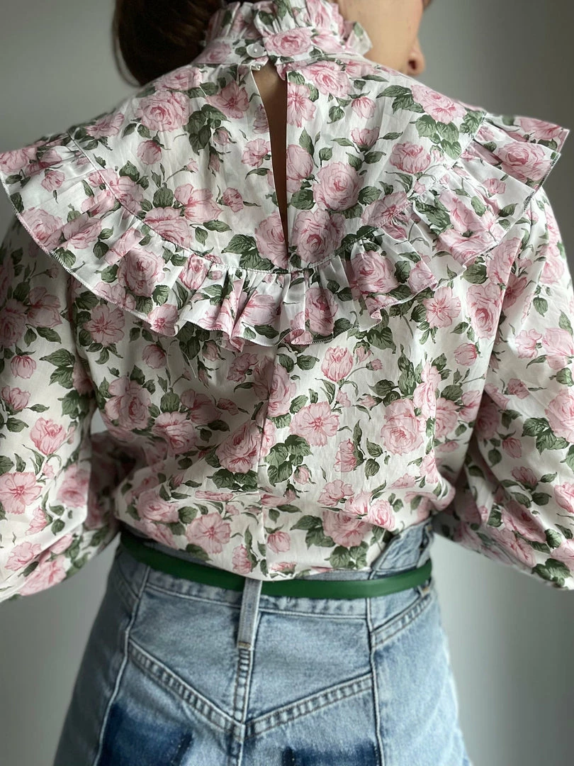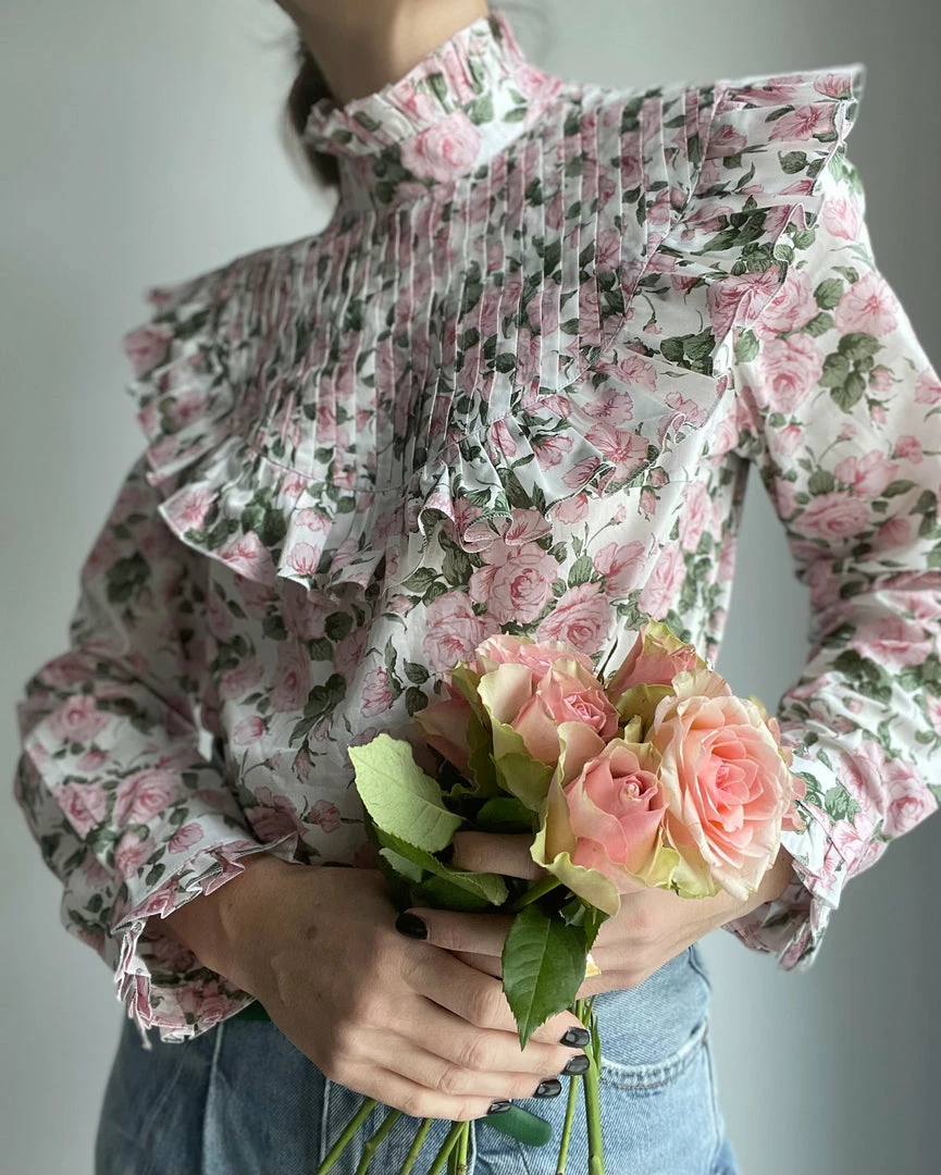The Rose Blouse is in itself a statement piece and will upgrade your favorite blue jeans or midi skirt. With delicate flowers in light rosé, Rose will instantly give you this spring feeling you were missing all winter long. Beautifully pleated with ruffles on chest and cuffs as well as a little high neck collar. Handcrafted in our atelier in Bavaria and made with 100% Tana Lawn cotton from Liberty London. Model is wearing a size XS (true to size). For pre-order only (takes about 2 weeks)