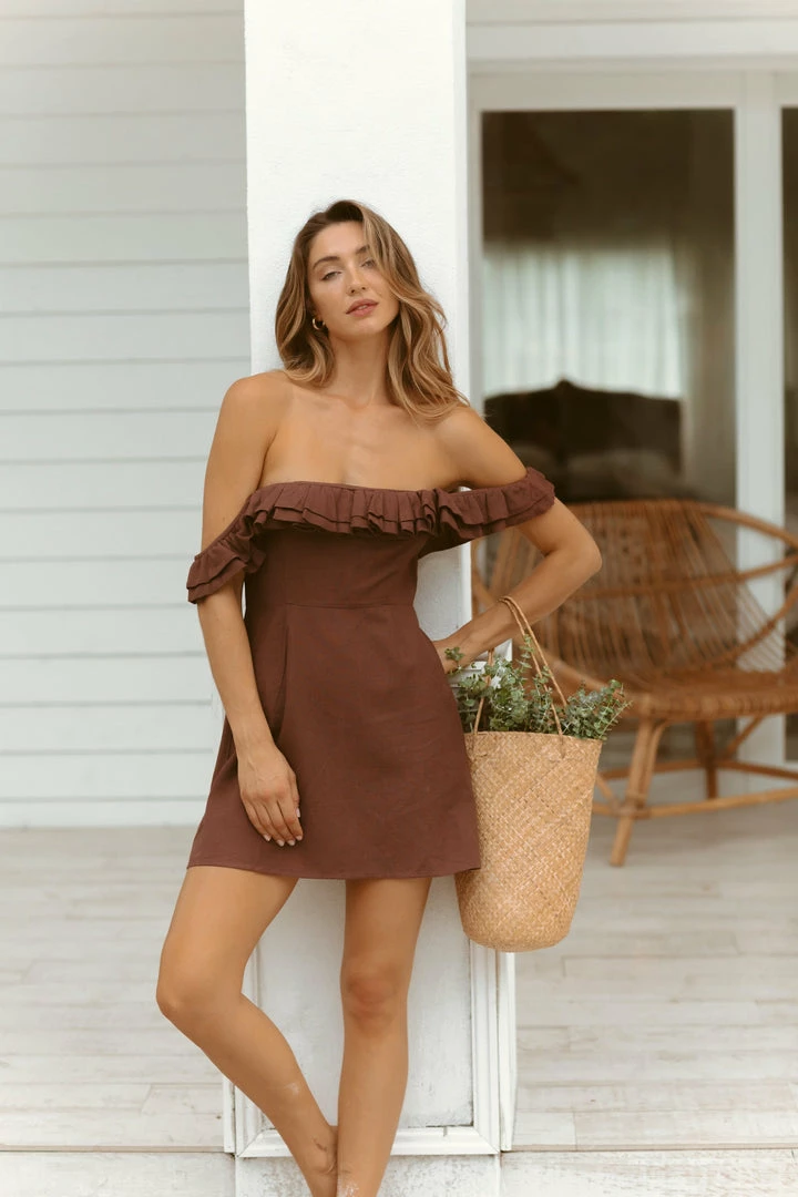 This pretty number is so flattering as it cinches at the waist and then flares out the perfect amount. Its ruffle on or off the shoulder detailing adds the prettiest touch.Â