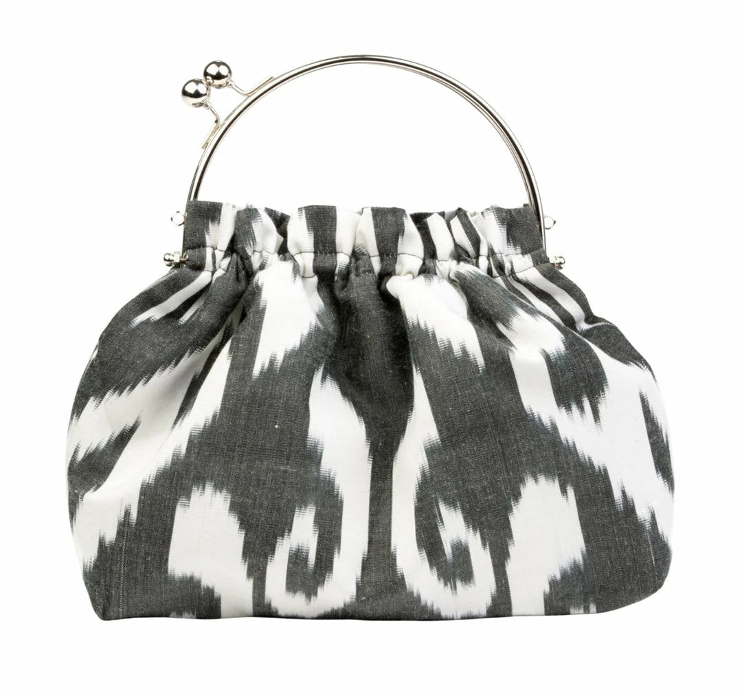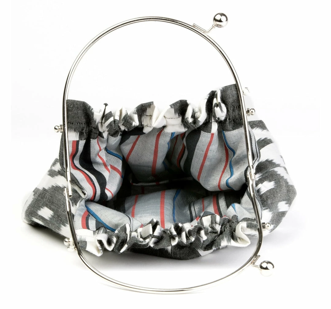 Hand-loomed and hand-dyed silk ikat, metal handle