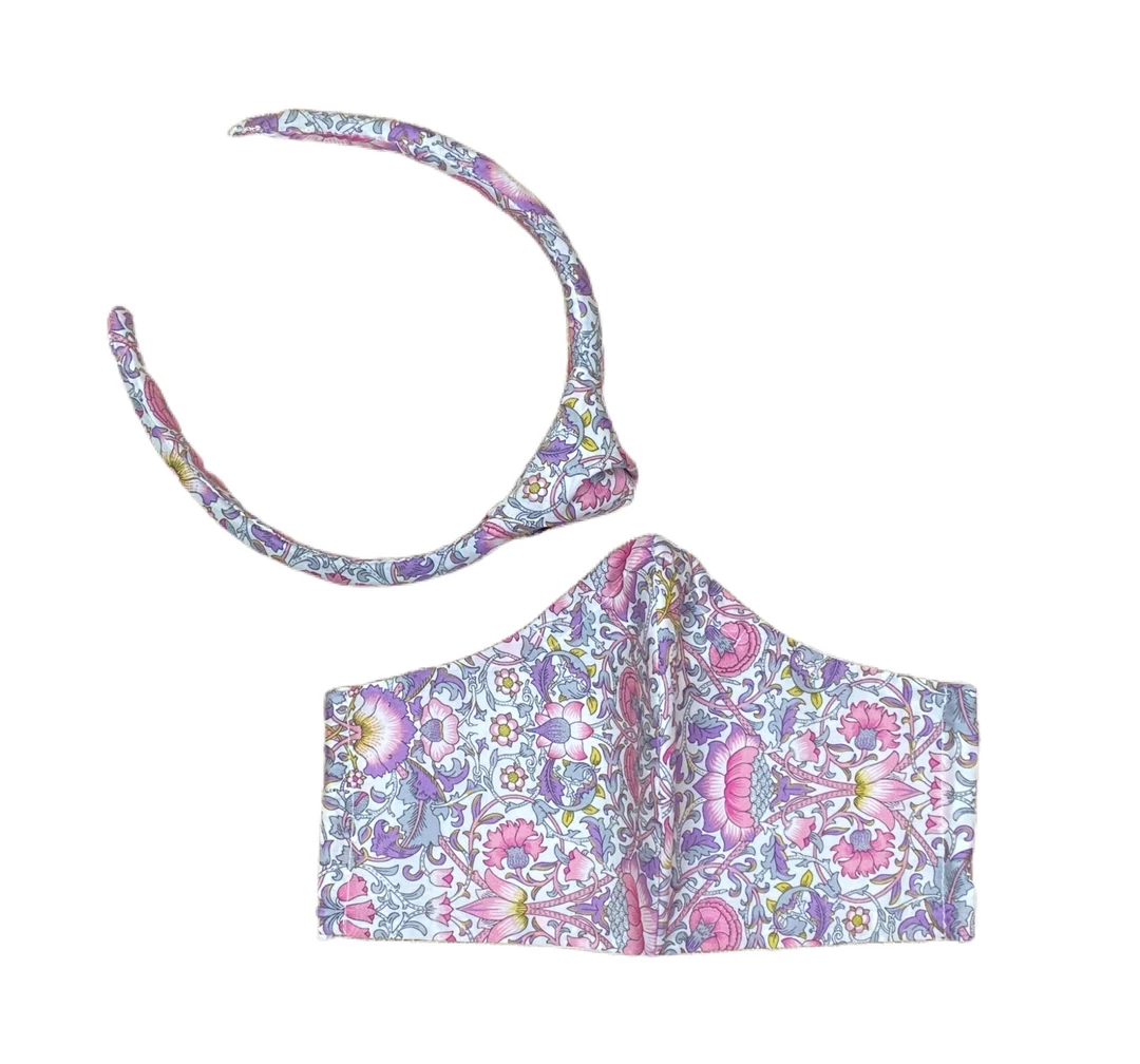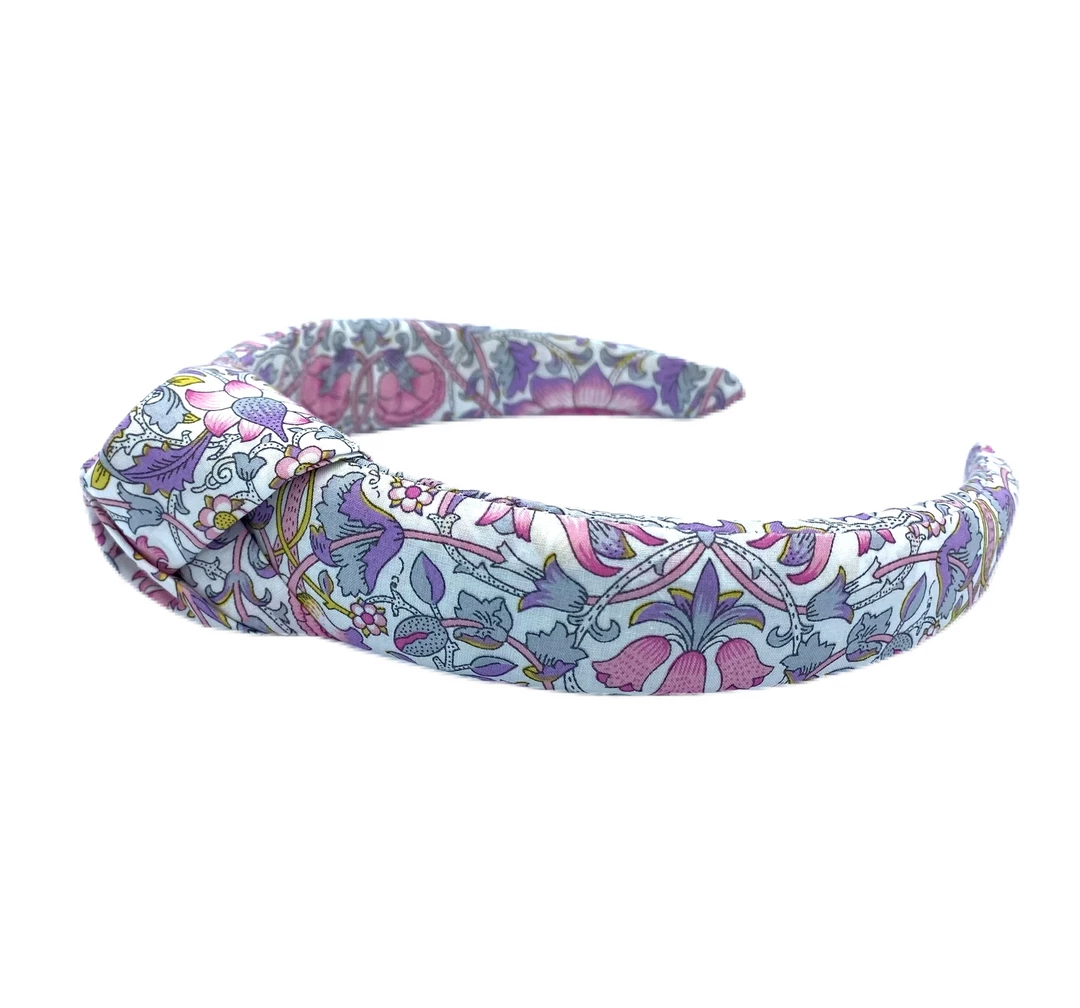 Product Description: Liberty of London cotton fabric wrapped and sewn around a solid, padded headband form. Knot in center of headband.