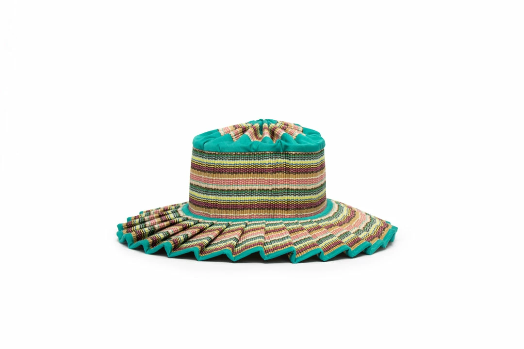 Beach House features a joyful blend of colours including pink, yellow, green, aqua, blue, caramel, dark brown and white, woven intricately in varying striped thicknesses in a horizontally striped pattern with bright teal fabric trimming.