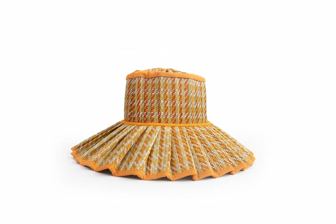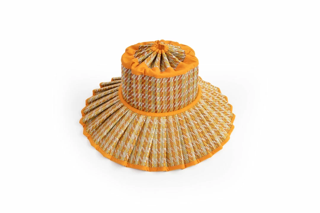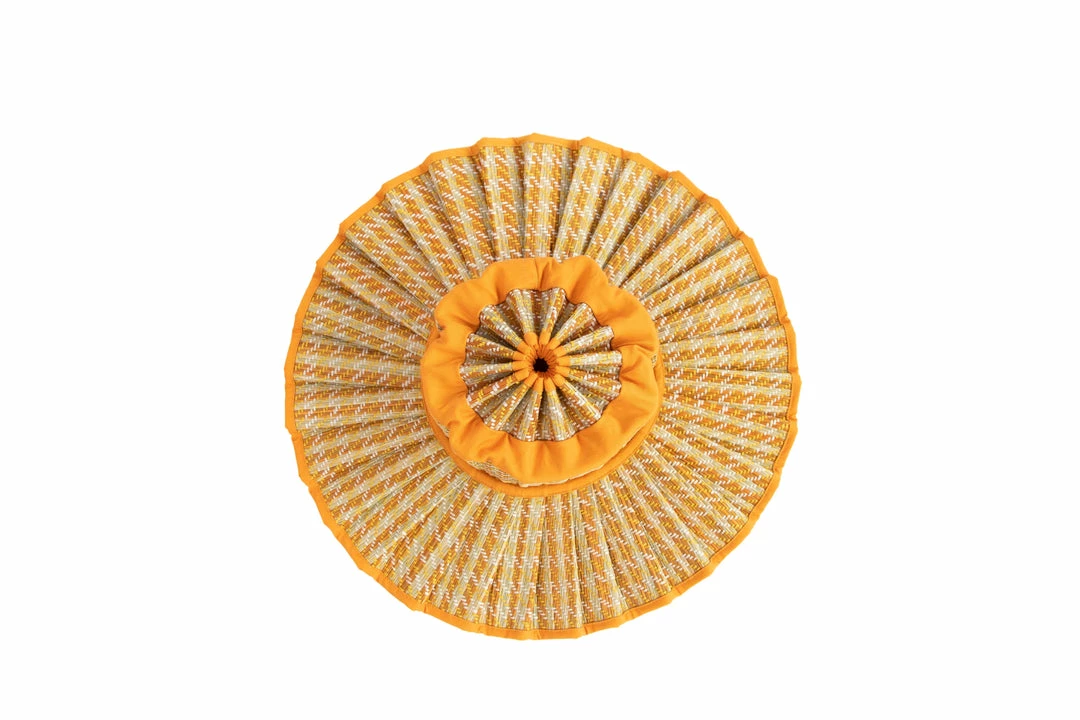 Sundeck features milk white and butter yellow alternating thread colours woven through its striped natural and sunshine yellow hand-dyed fibre base, with a marigold fabric trimming and a houndstooth inspired pattern.
