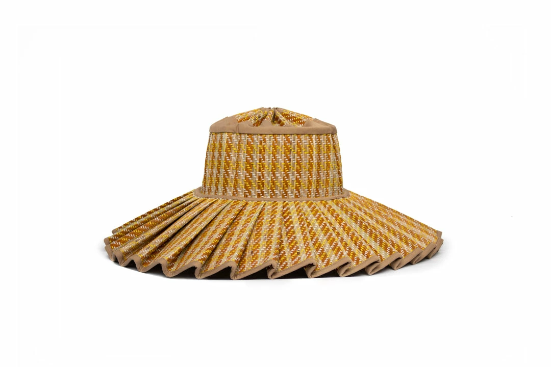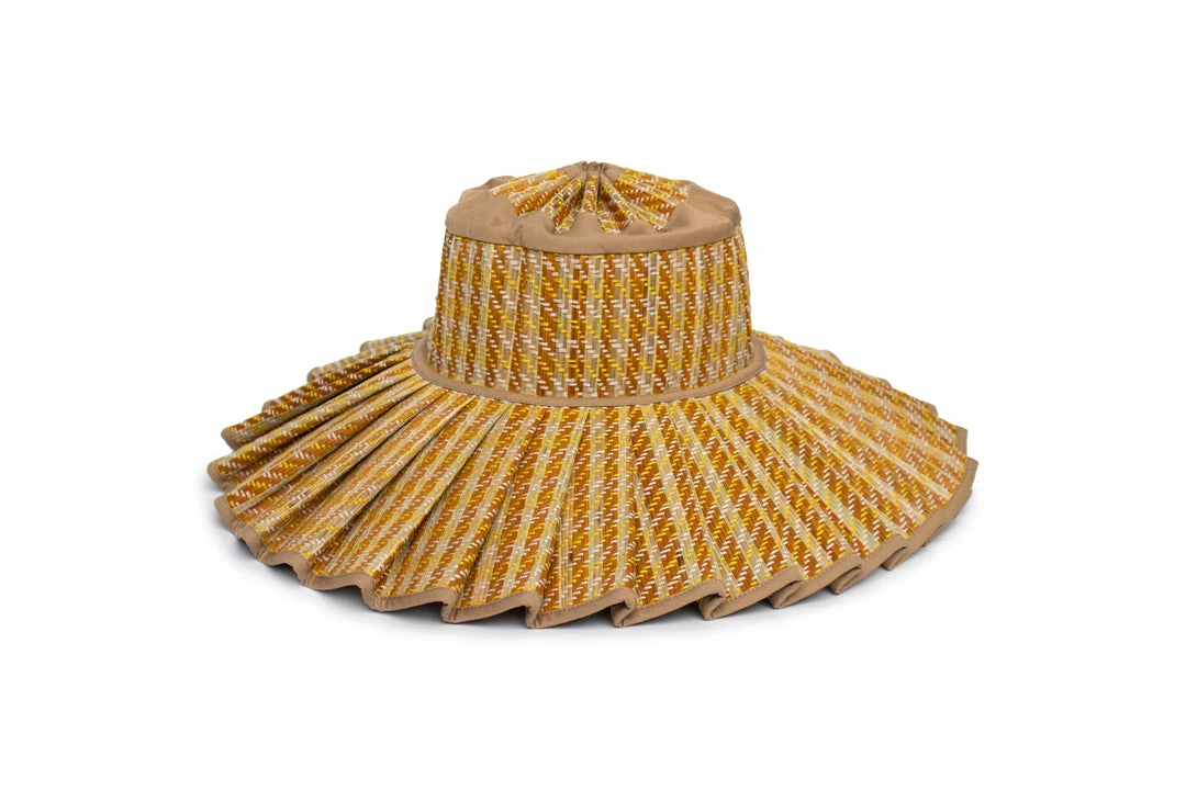 Umbria features milk white and butter yellow alternating thread colours woven through its striped natural and sunshine yellow hand-dyed fibre base, with a toffee brown fabric trimming and a houndstooth inspired pattern.