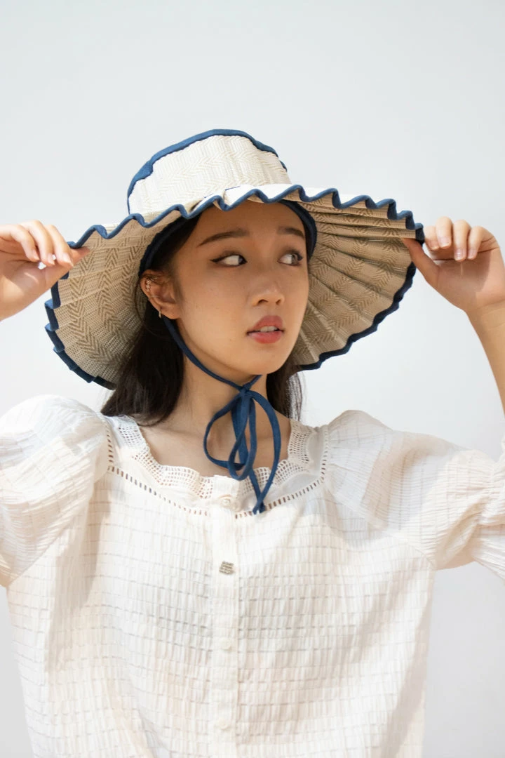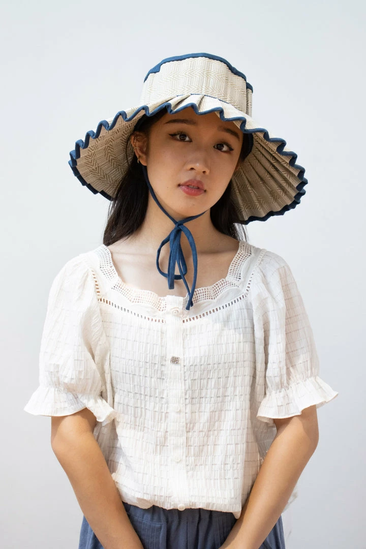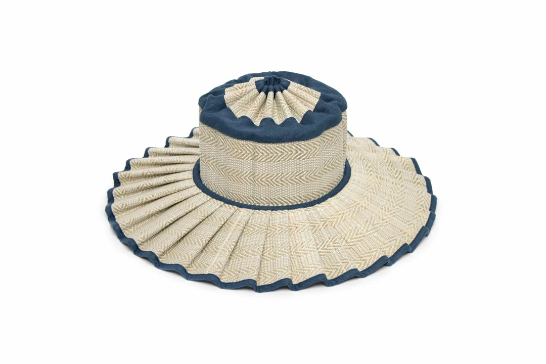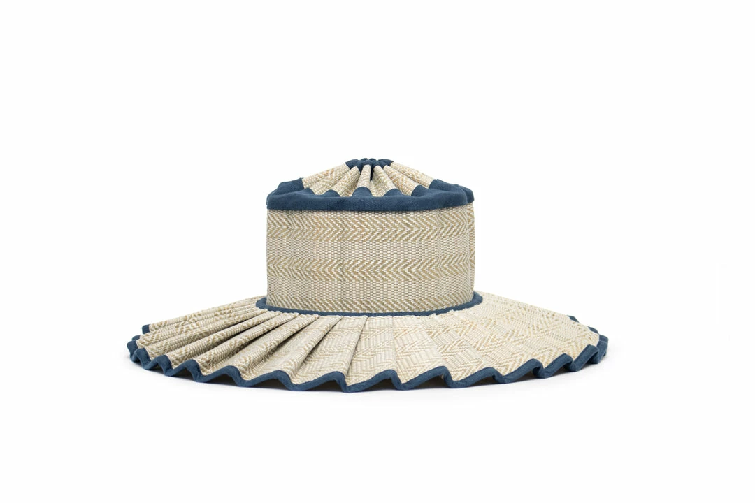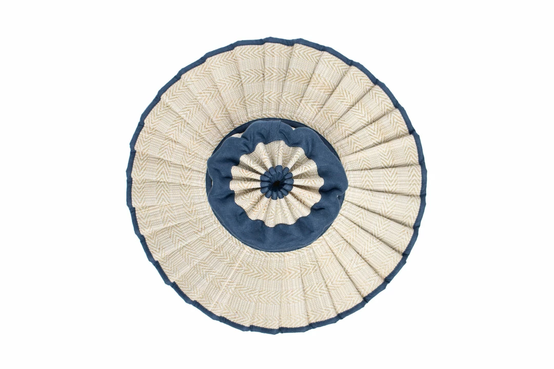Prussia Cove features shell-white coloured thread woven in an alternating diagonal geometric pattern, through its natural grass fibre base, with navy coloured 100% linen fabric trimming.Â