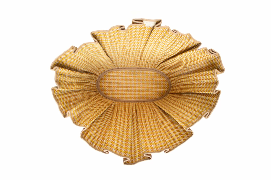 Umbria features milk white and butter yellow alternating thread colours woven through its striped natural and sunshine yellow hand-dyed fibre base, with a toffee brown fabric trimming and a houndstooth inspired pattern.