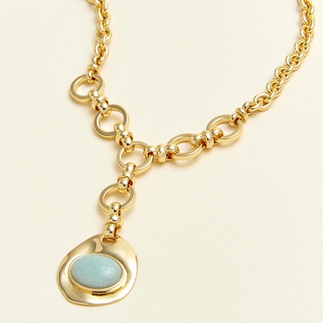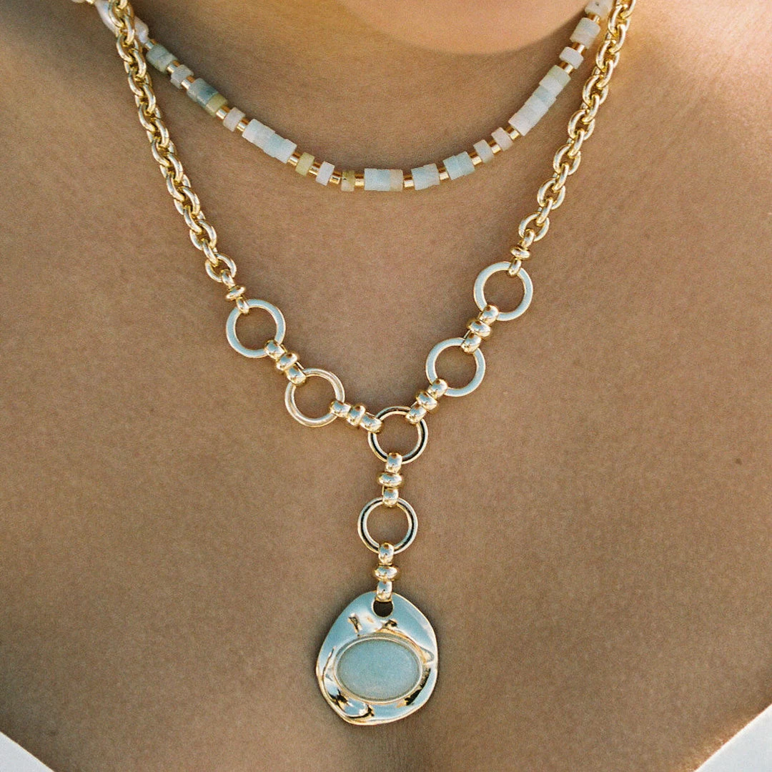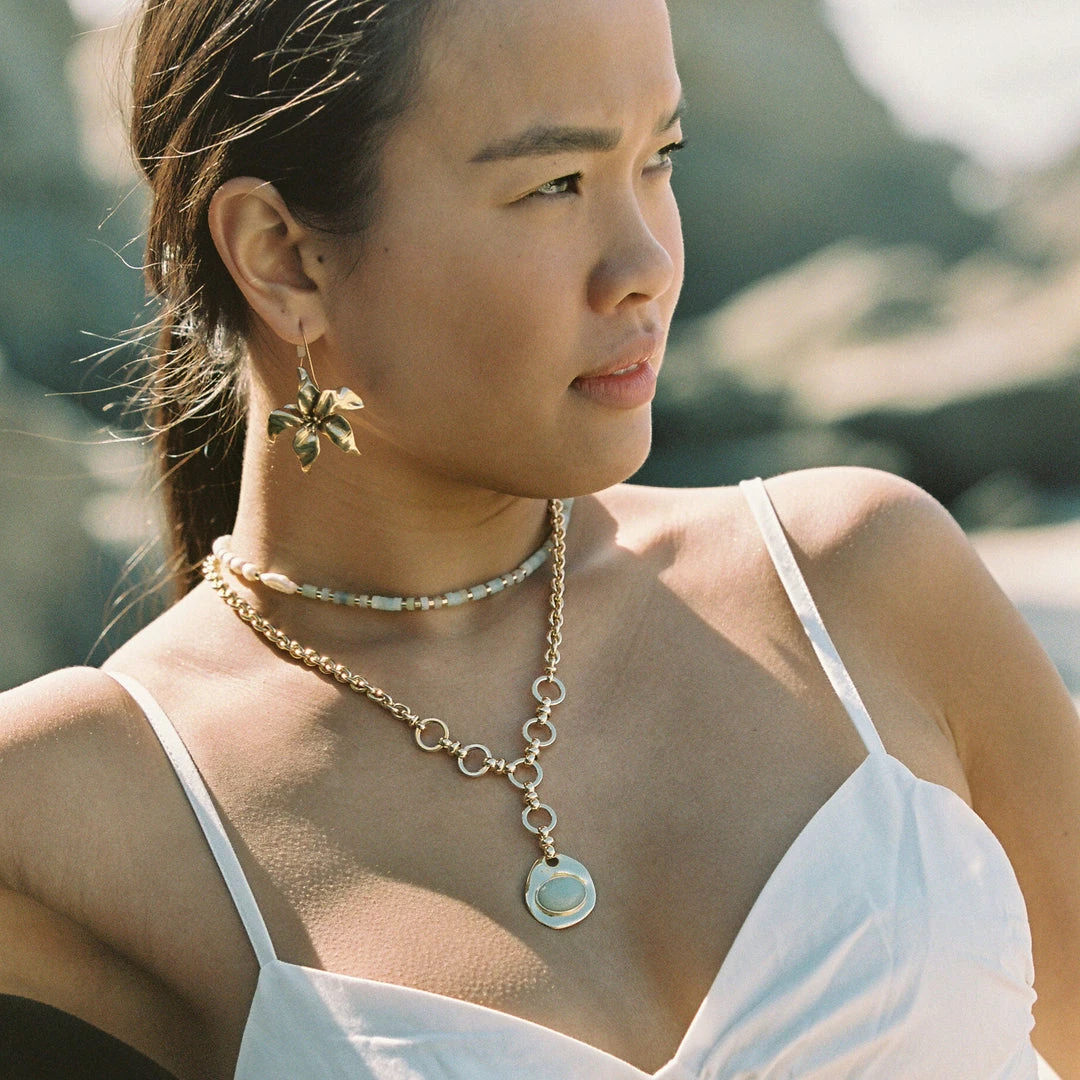 Combining two unique chains, this Helen pendant necklace is both sophisticated and sculptural. A gorgeous, unparalleled style, harmonizing the movement of light, shadow and the coming of spring. Layer alongside our Jody strand and Claire earrings for a refreshingly-cool look.
