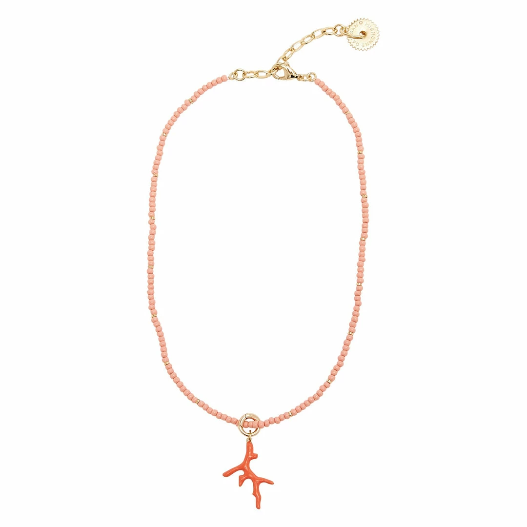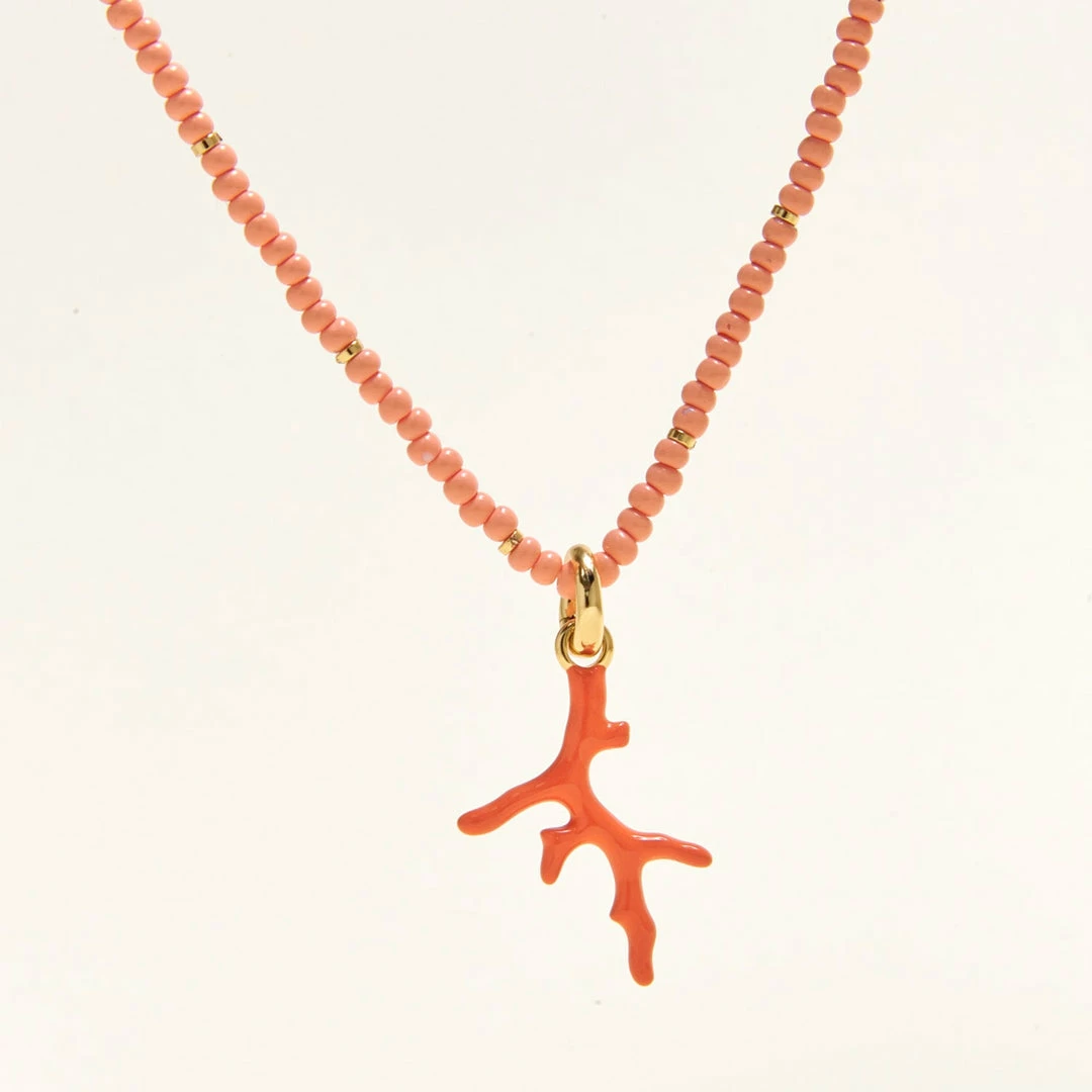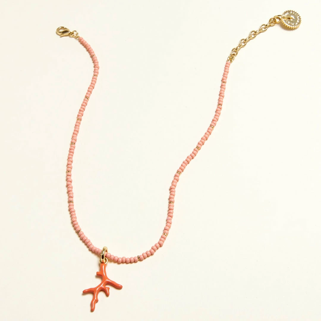 Translating our love of sand and sea, a collarbone-grazing design strung with coral pink beads and an enameled coral charm. Style with the Fletcher necklace or Kassia necklace. This is an office layering favorite.