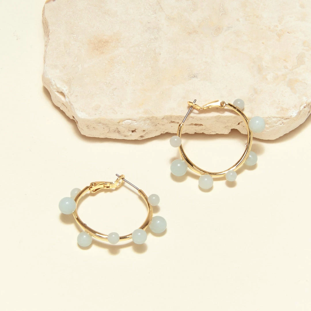 A vision of modern femininity, these sculptural hoops have asymmetrical organic stones with a bespoke quality to them. A gorgeous update to our beloved Mini Isla hoops, these are just as easy to wear daily, and perfectly lightweight in the perfect sea glass color.