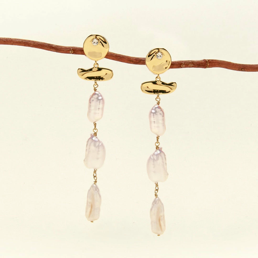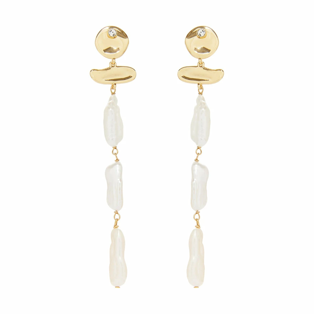 Introducing elongated freshwater pearls, this flattering shoulder duster has an organic wavy disc and sculptural undertones. We are dreaming of wearing these with bare tan skin on the sea shores but until those moments we are content styling with our Neptune charm necklace and luxurious crochet knits.