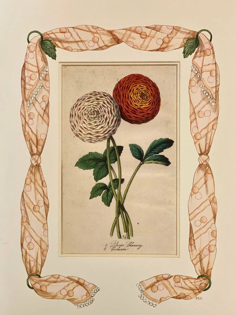 Missy Norton Art & Games Ranunculus Antique Print With Hand-painted Fabric Border