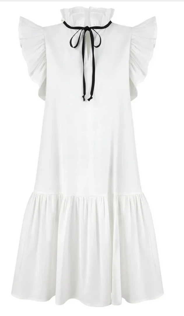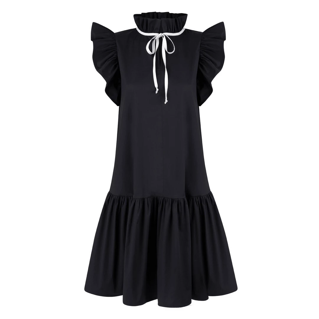 This A-line sleeveless dress has a ruffled stand-up collar with a bow detail. It has exaggerated ruffles on the sleeves. The drop-waist silhouette makes in comfortable and roomy. Runs large. Side pockets.