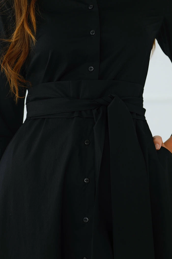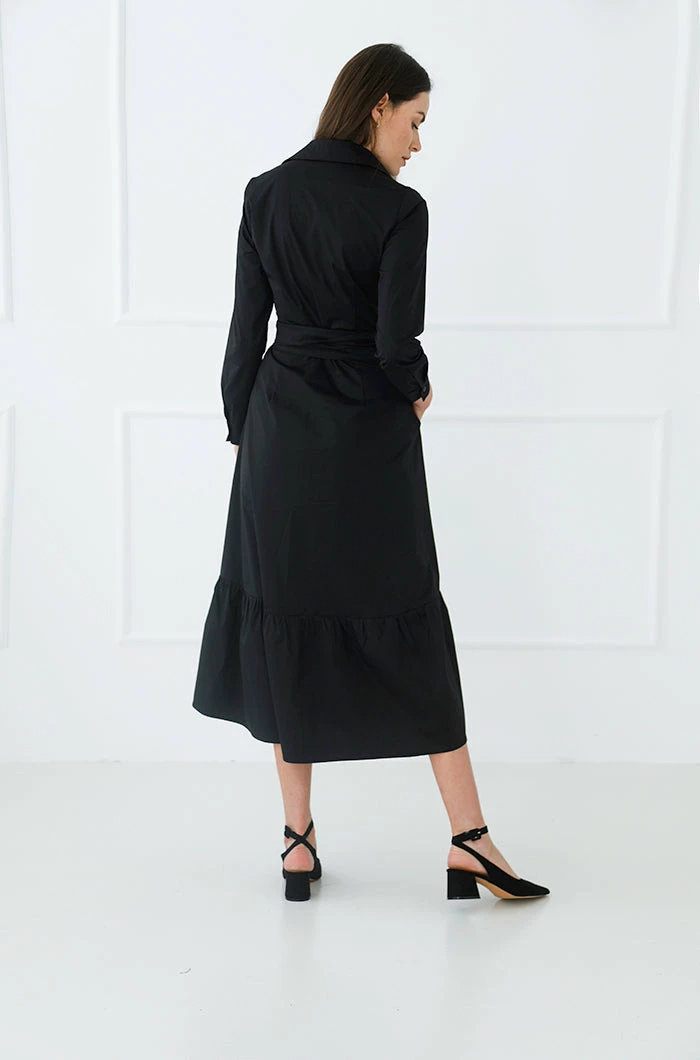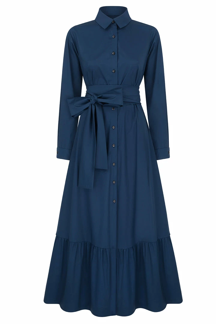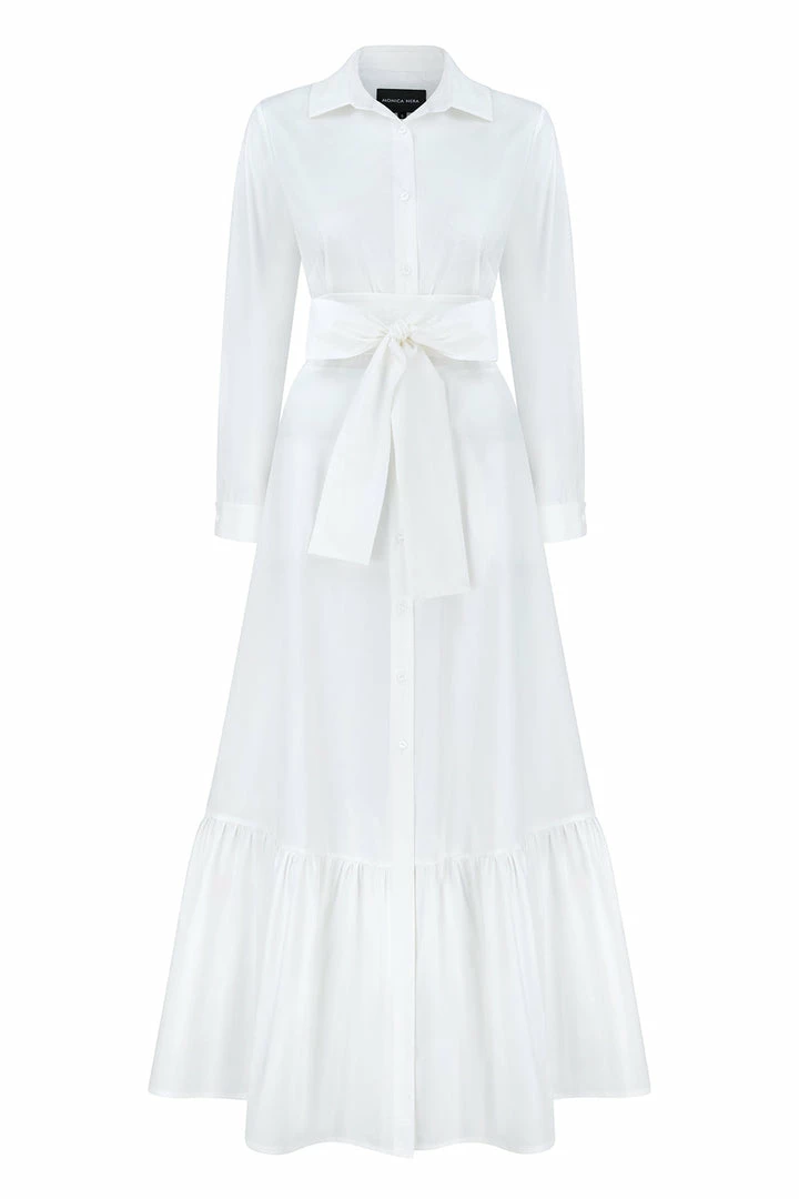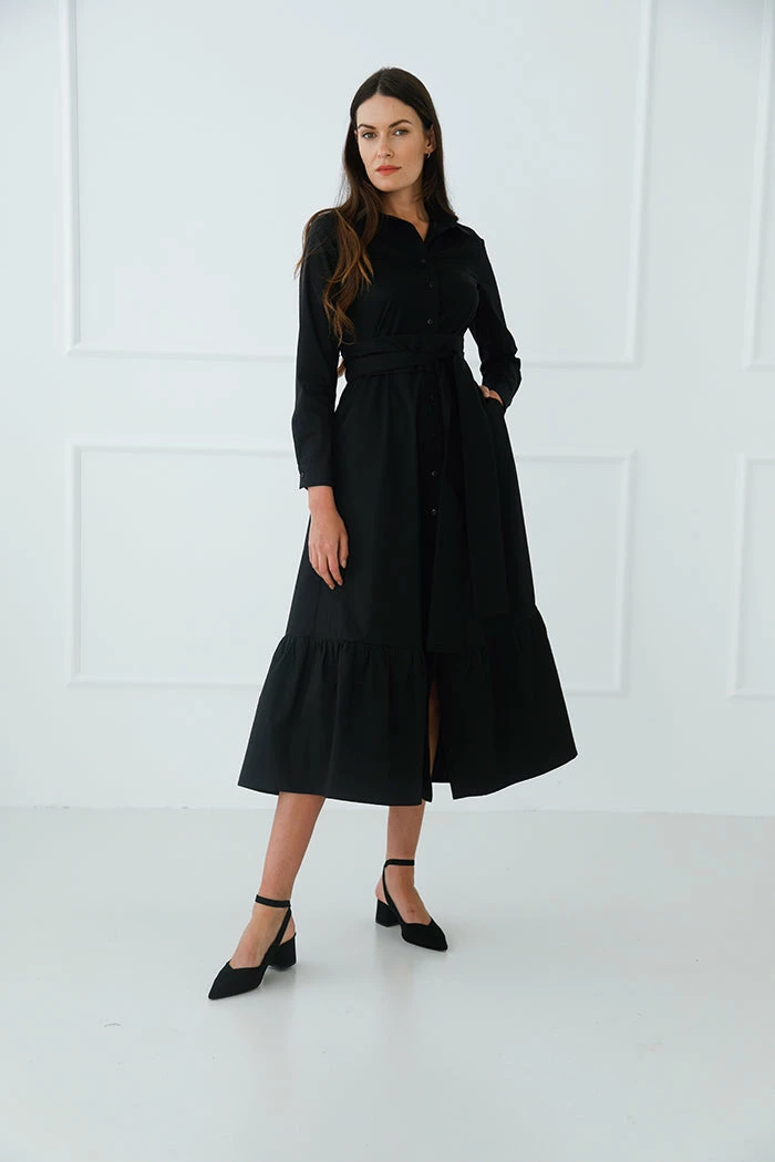 Carrie is a maxi-length shirt dress with an A-line silhouette. It has a classic pointed collar, structured cuffs, and long sleeves that can be worn long or rolled up for a more casual look. Buttons from the collar to the hem allow you flexible styling options, making Carrie perfect for professional wear or flirty evening occasions. The dress is finished with a ruffle effect at the knee and a signature wrap-belt that can be styled as you like. Comfortable pockets add the extra touch to the look.