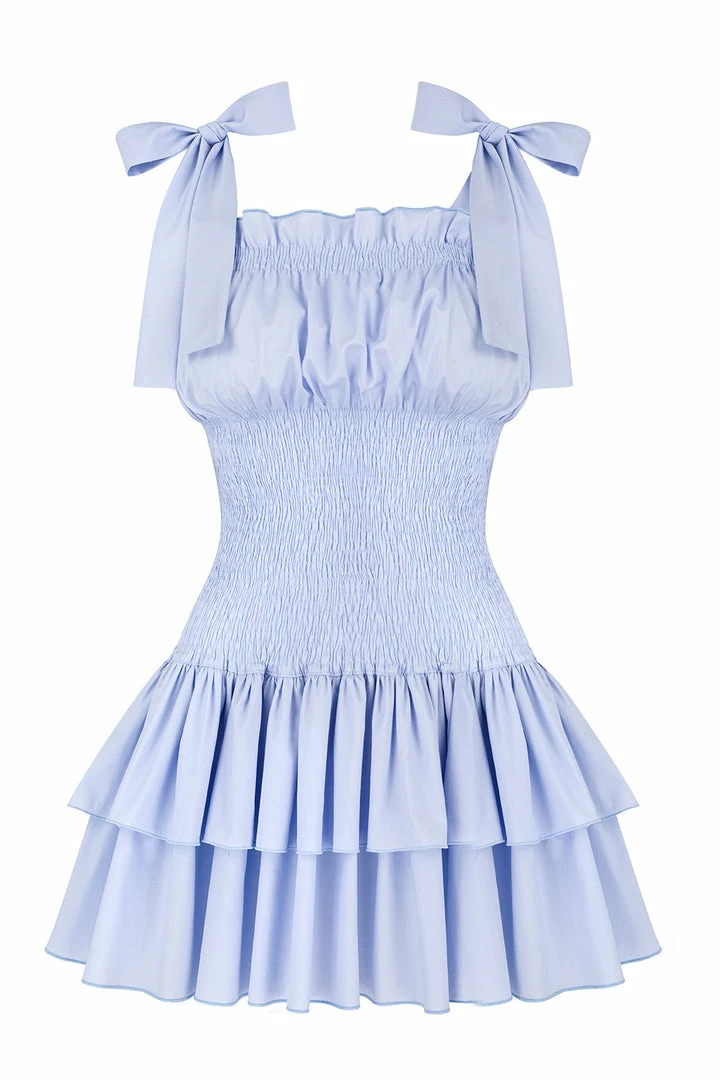 Made from our signature eco-cotton, Madeleine is a perfect mini dress for summer wear. The elastic fitted waistband, tight ruffle effect, and above-the-knee-length cut make this a girly piece. The comfortable holders are adjustable and can be tied to bows or knots, giving the dress a playful touch.