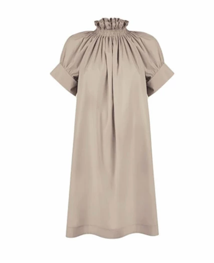 Made from our signature eco-cotton. Franka is a lightweight cotton midi-dress with a dramatic silhouette and a straight fit. The stand-up collar gives the fabric a ruffle effect, and is adjustable by stretch drawstring. The short balloon sleeves are finished with thick cuff bands. The comfortable fit and side pockets make Franka perfect for everyday wear.