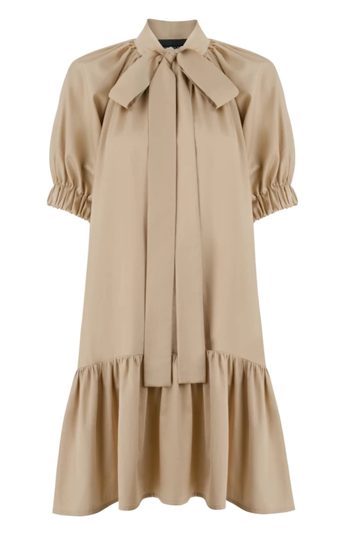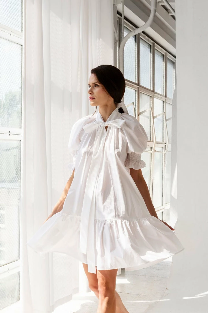 Made from our best quality cotton, Josephine is an elegant straight-cut dress with an above-the-knee cut. Ruffle details around the shoulders, sleeves, and hem add an extra feminine touch, and the bow at the neckline elongates the body.