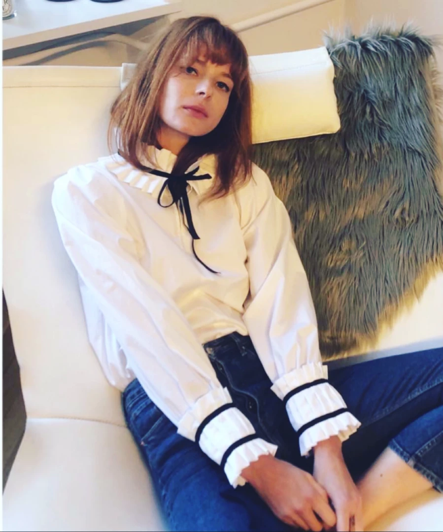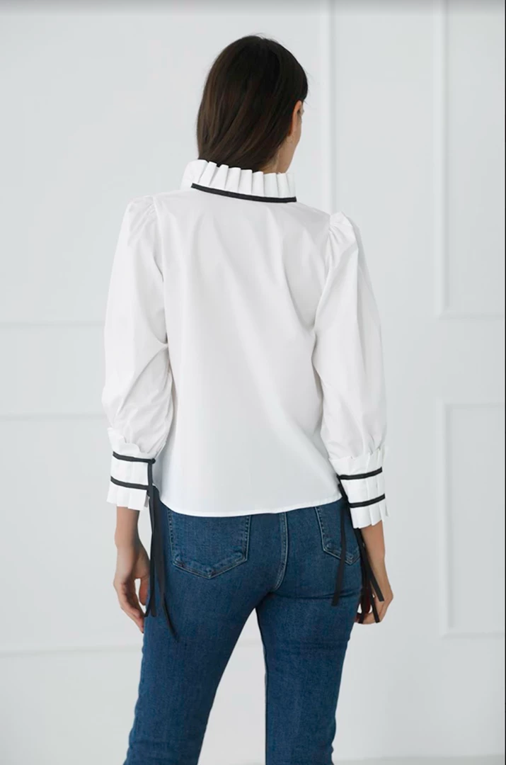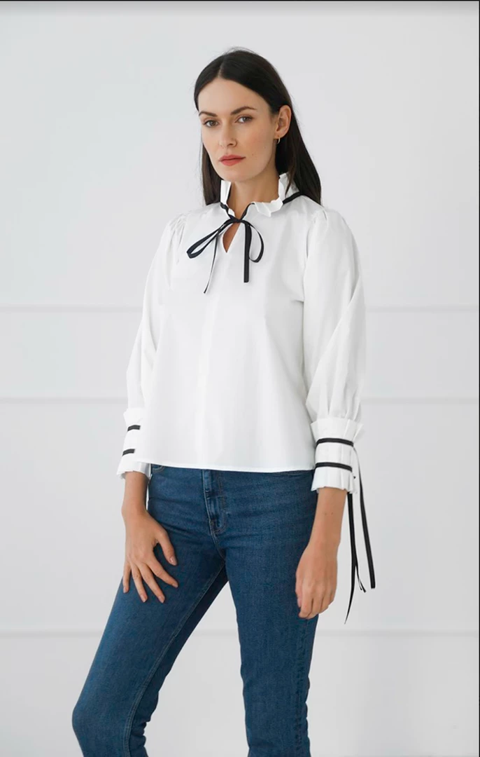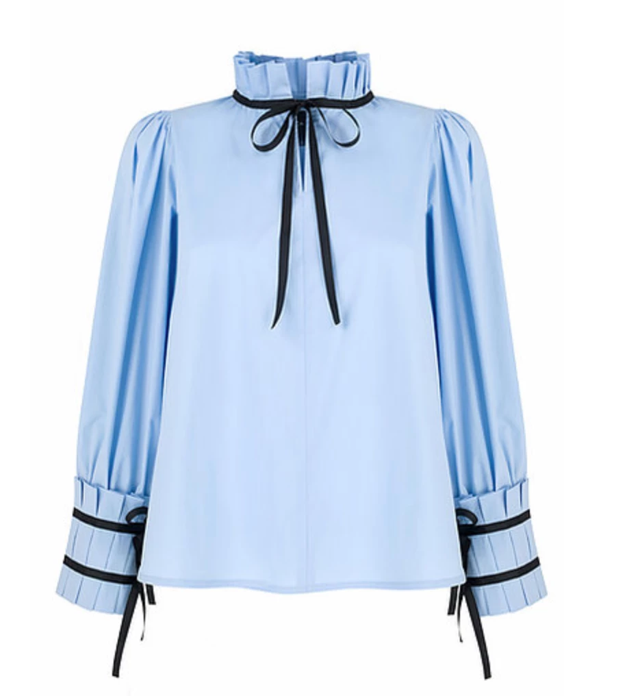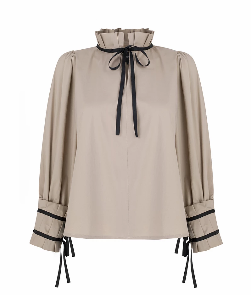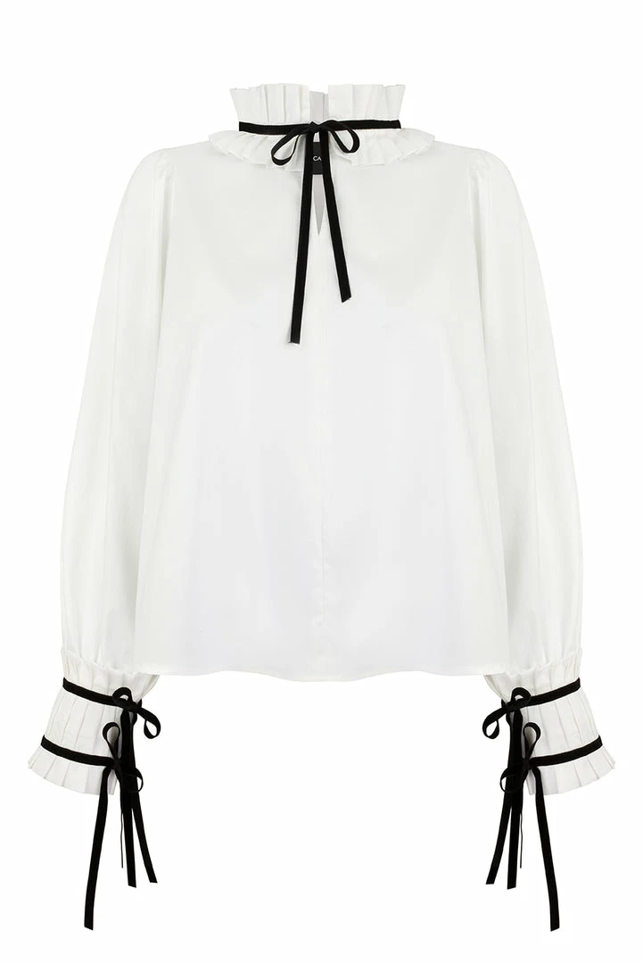 This relaxed fit blouse has a ruffled stand-up collar and cuff with a bow detail.