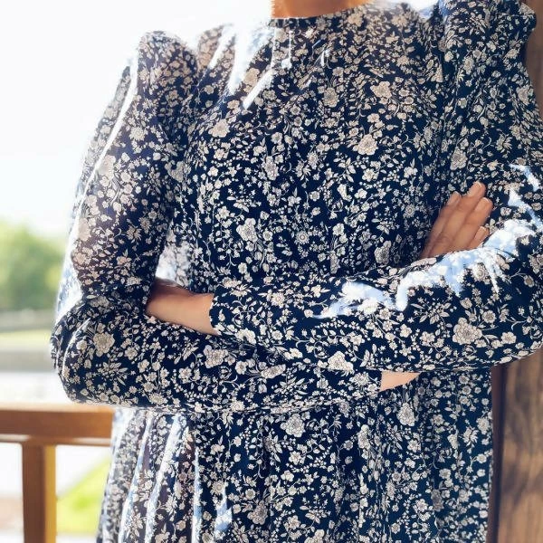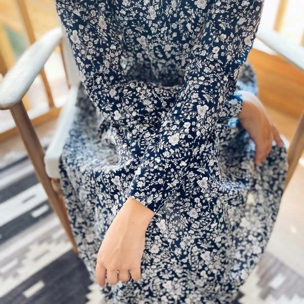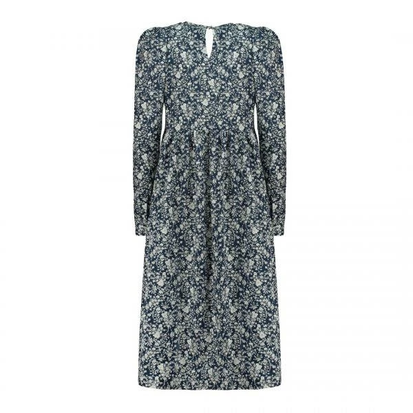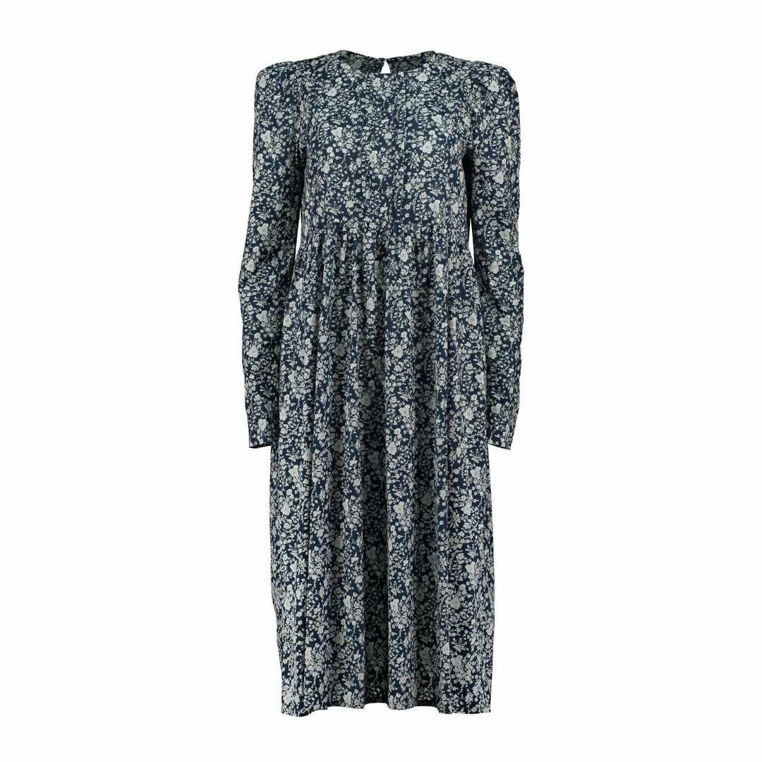 It has a simple and comfortable cut, slightly puffed sleeves at the shoulder, tuck on the chest and a midi length ideal to wear both during day and night.