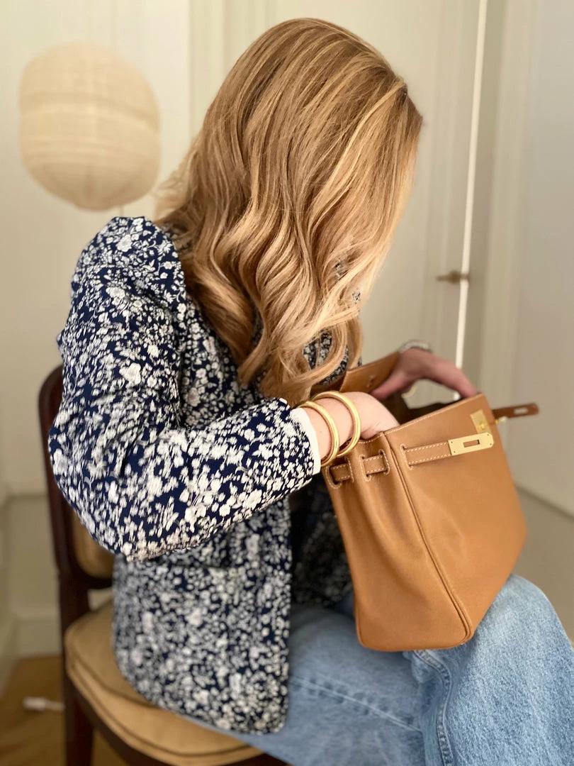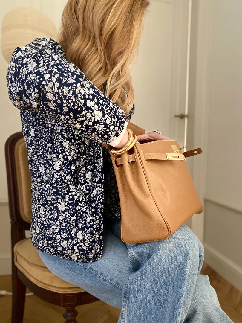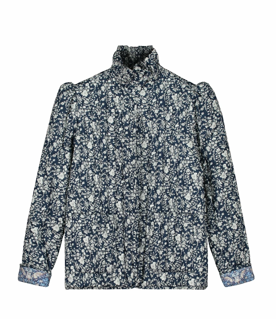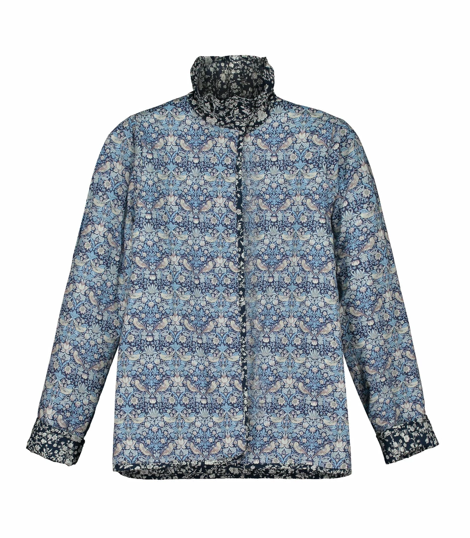 The Nicoletta quilted reversible jacket is quilted by hand and created with two classic and elegant prints from Liberty London — the outside in a timeless navy and white floral print and the inside in a William Morris birds design.