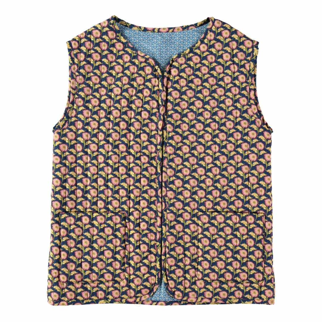 Quilted by hand in our spanish atelier with two amazing new floral prints in blue, big daisies outside and little sunflowers inside, and it is reversible, so you have 2 vest in 1!