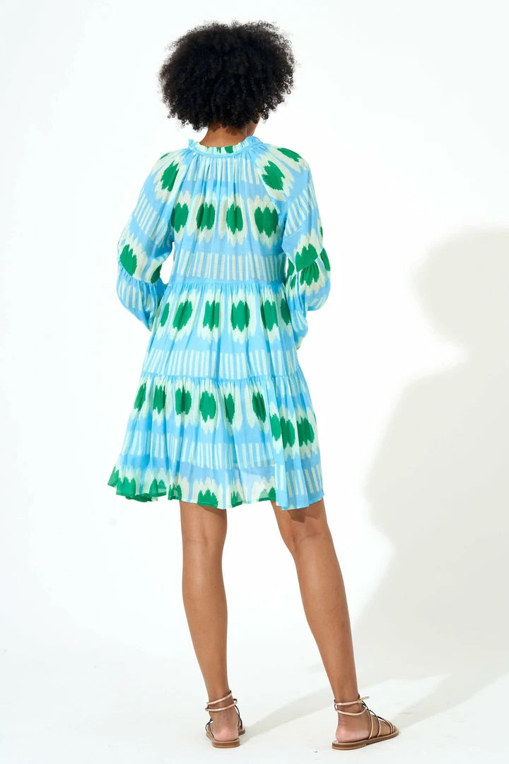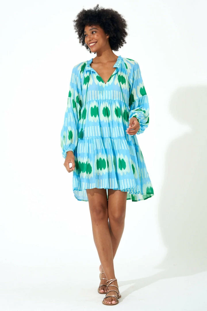 The Balloon Sleeve Short Dress in our eye-catching Ikat print is made with luxuriously soft Silk and Cotton. This pullover dress features a tassel tie neck, elastic cuff balloon sleeves, and a tiered skirt. Model is 5’8′ and wears a Small.