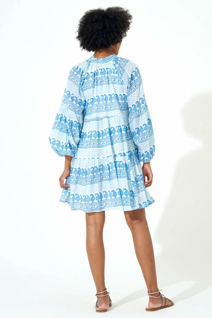 This Balloon Sleeve Short Dress is made with luxuriously soft Cotton in a fresh blue and white print. This pullover dress also features a tassel tie neck, elastic cuff balloon sleeves, and a tiered skirt for added movement. Model is 5’8′ and wears a size Small.