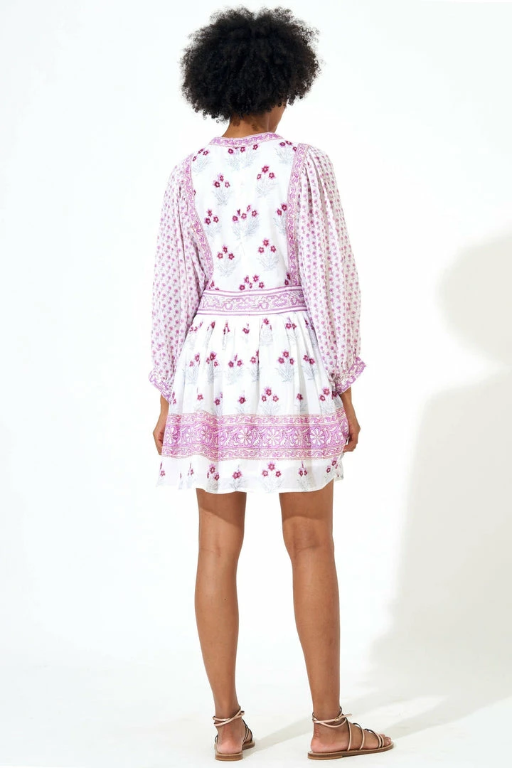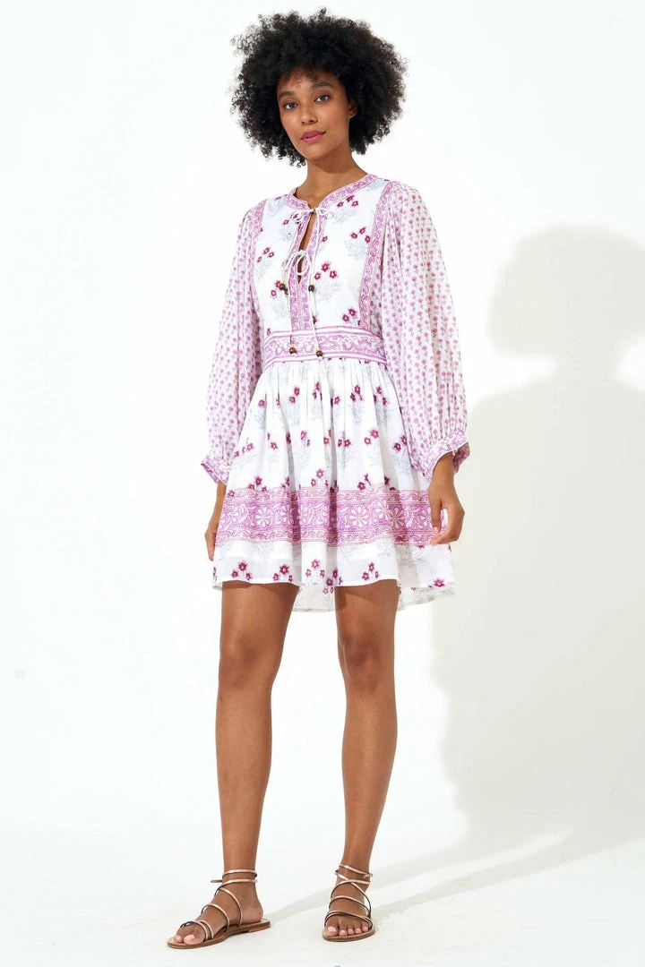 This Balloon Sleeve silhouette features tie front accents, beautiful trim detailing at the cuffs and hem, and is delicately stitched throughout the top