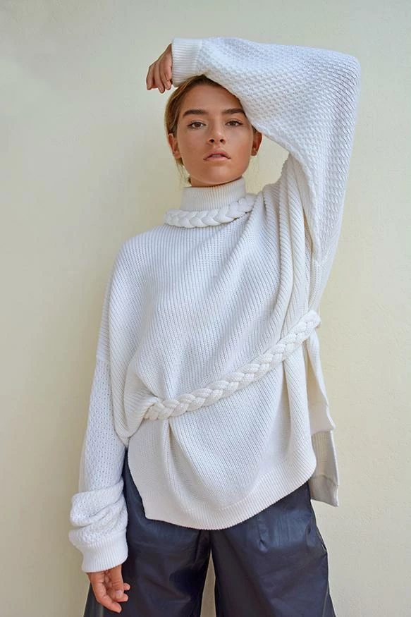 Meet the Belt Jumper in Ivory! The slouchy Sunday favorite made from super soft wool with signature braiding our around the neck.Â
