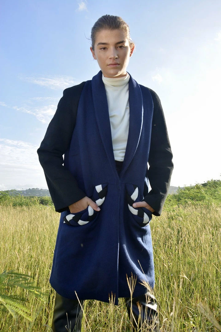 Meet the Plot Coat! The easy fitting, rounded midi length coat with plait detail over the pockets. The front closes with a concealed zip. Made in contrast Black and Navy soft and wool. For a snugger fit we recommend going to down a size from normal.Â