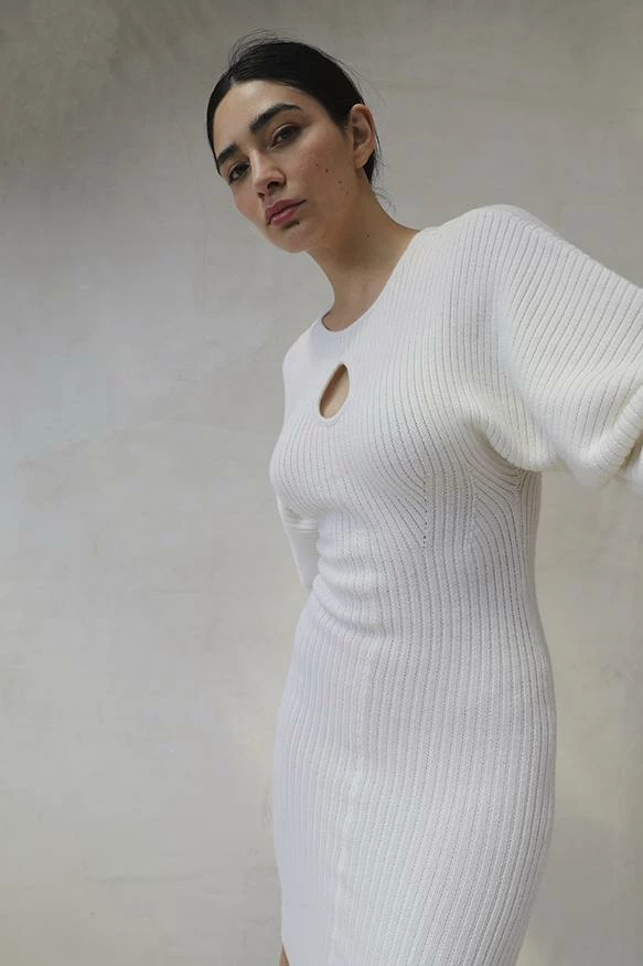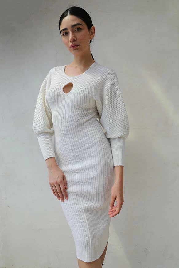 Meet the new Plunge Dress in Ivory…the ultimate sleek yet comfy dress that will become your next go-to wardrobe staple! Fitted shape with balloon sleeves, fitted cuffs and cut out at front.