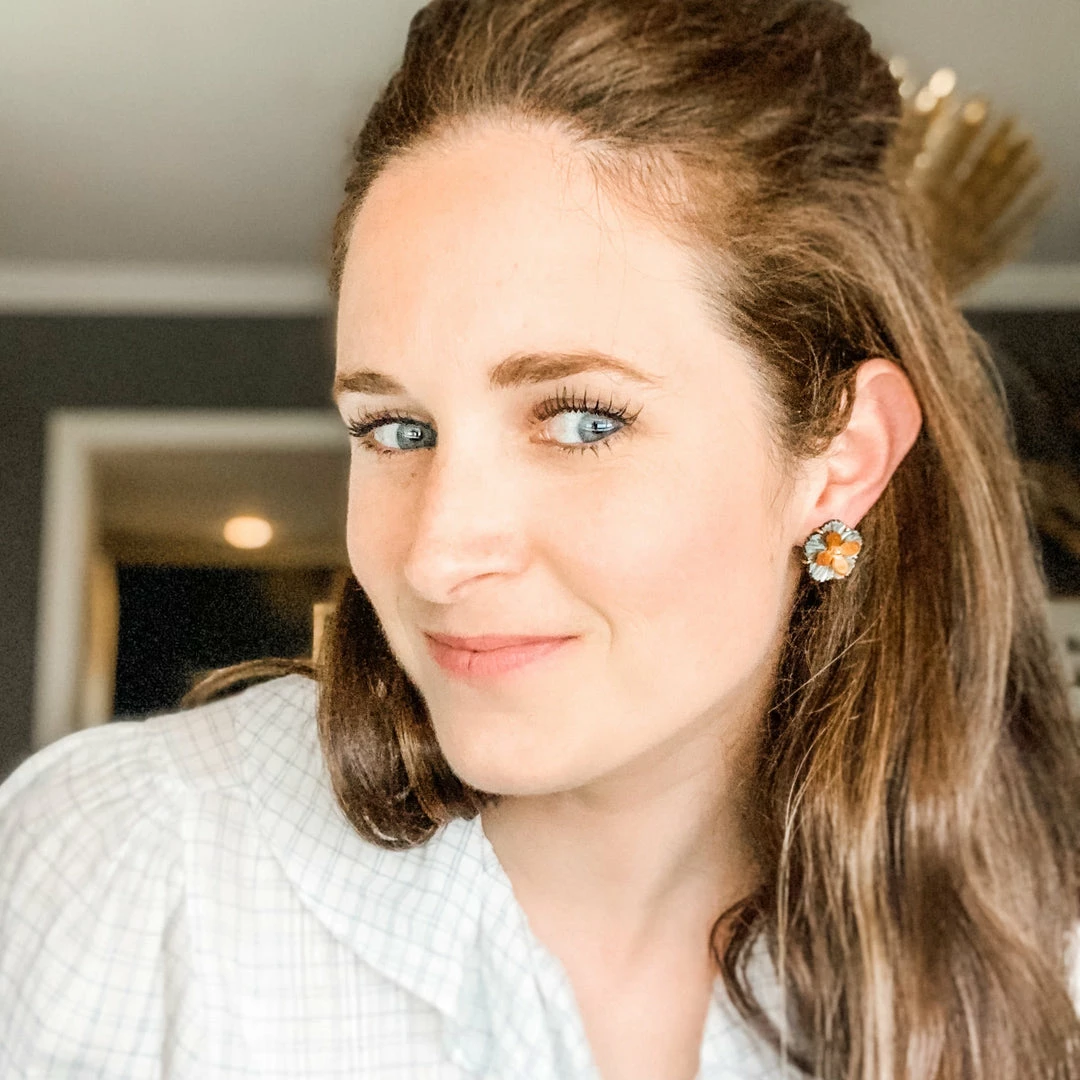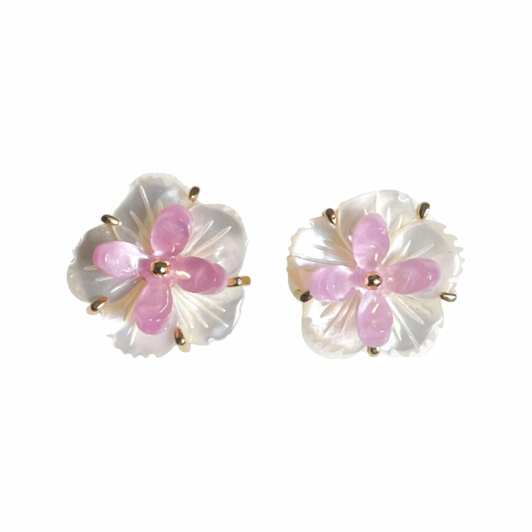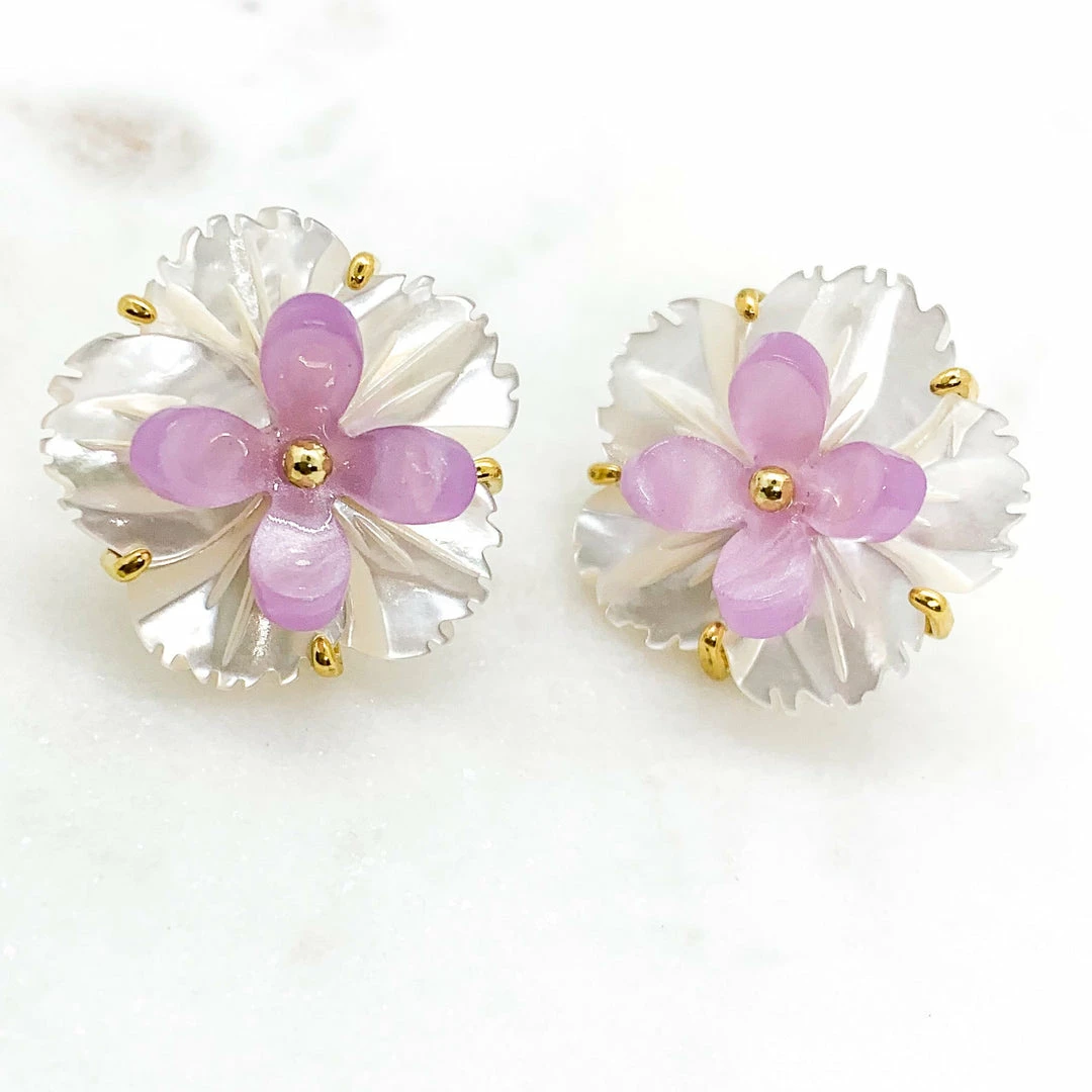 A perfect feminine touch to an every day outfit. the mother of pearl flower with resin detail makes these earrings modern, simple and chic. 3/4”