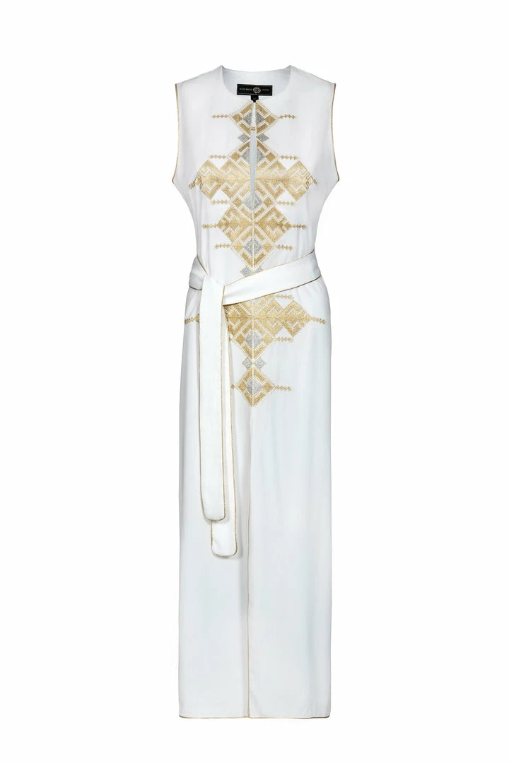 A timeless classic, the Aftab Dress is a straight-cut lightweight summer staple. Wear it like a kaftan or belted to cinch your waistline. Featuring gold and silver thread Balouch embroidery and gold trim, as well as a center midi slit for added comfort. Wear this piece all summer long with scrappy sandals or dress up with metallic heels.