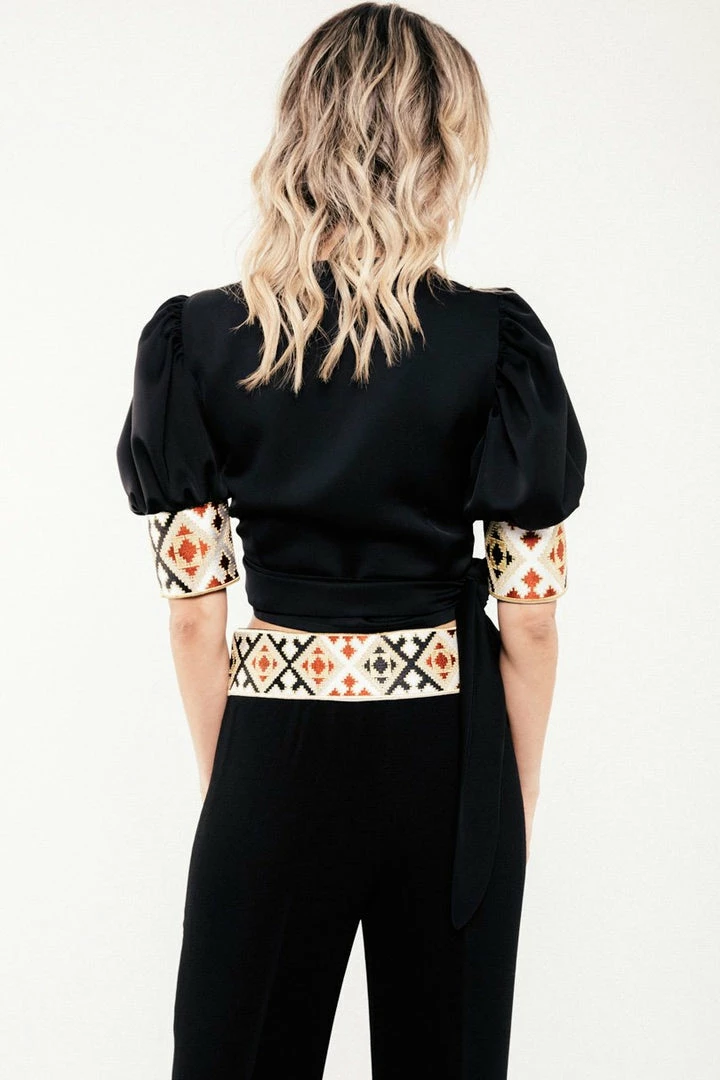 Our hip-length crepe wrap top features a V-Neck with a crossover front. The waist-defining cut is both feminine and flattering while the puffed sleeves further accentuate a cinched waist.Â