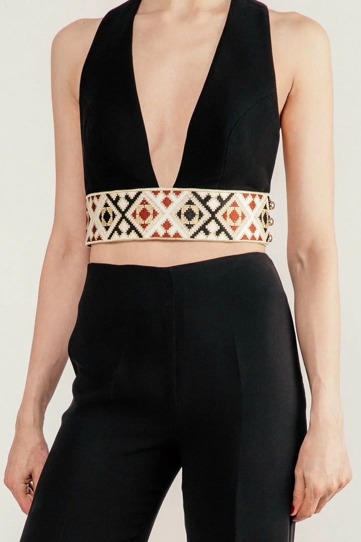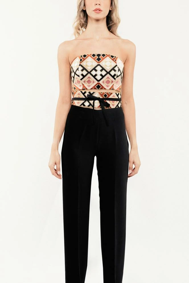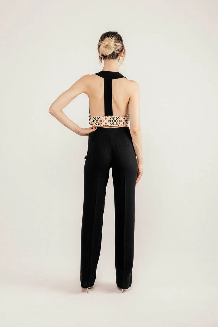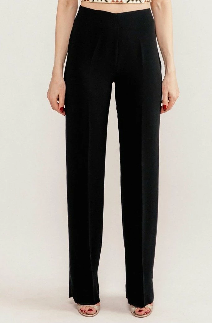 These pants are cut from textured black crepe and sit flatteringly high on the hips. These are the same cut as our signature embroidered Kaveh Pants, but without the embroidery for a more versatile look.