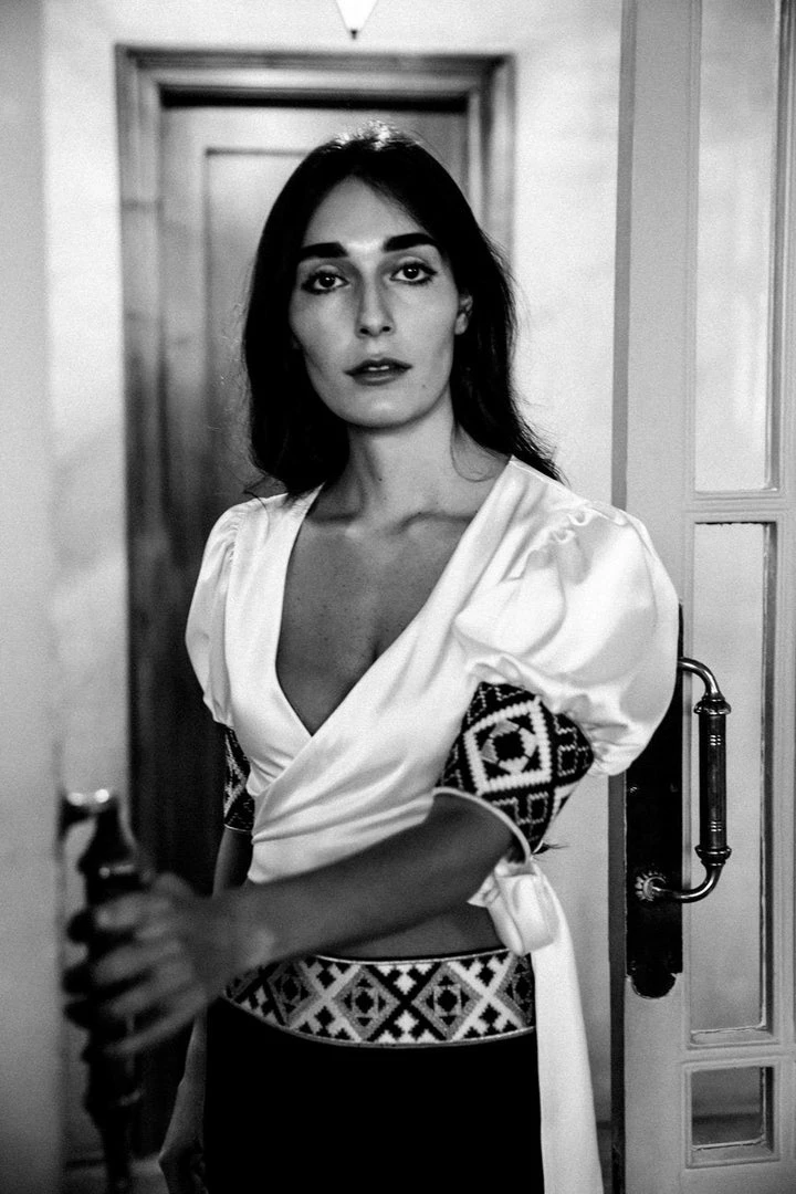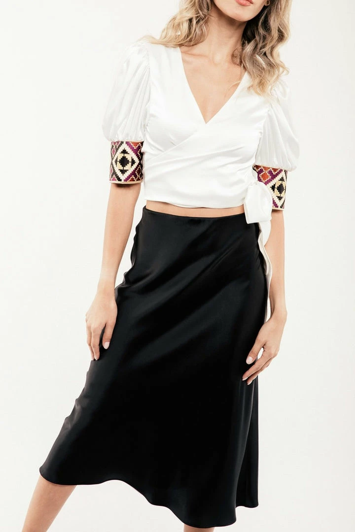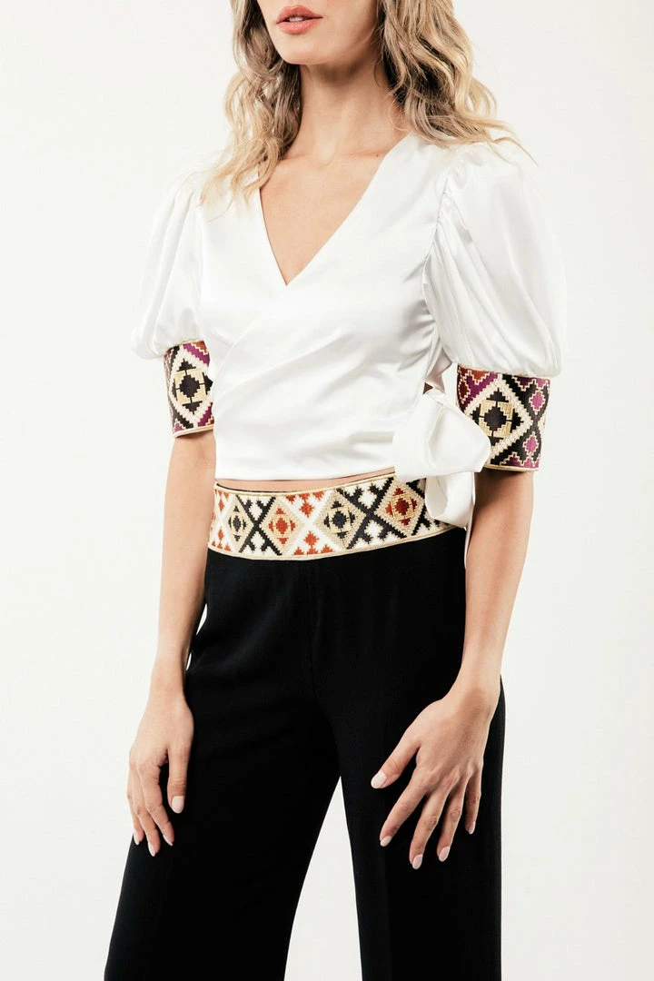 Our hip-length crepe wrap top features a V-Neck with a crossover front. The waist-defining cut is both feminine and flattering while the puffed sleeves further accentuate the cinched waist. Style with our Slip Skirt, any Tuxedo pant, or even a ball skirt.