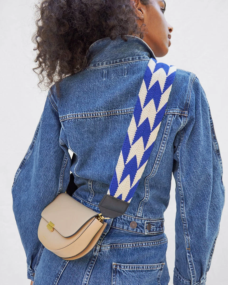 in shades of natural and cobalt blue and finished in buttery black leather Our Classic Salt straps have a gorgeous textured look that set it apart from the crossbody straps of your past. What’s more is we give back with each strap sold through our partnership with Nest, a non-profit dedicated to the advancement of global artisans through transparency, sustainability and advocacy.