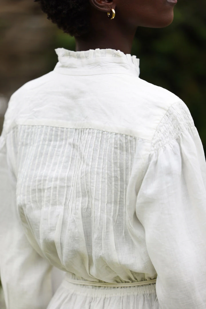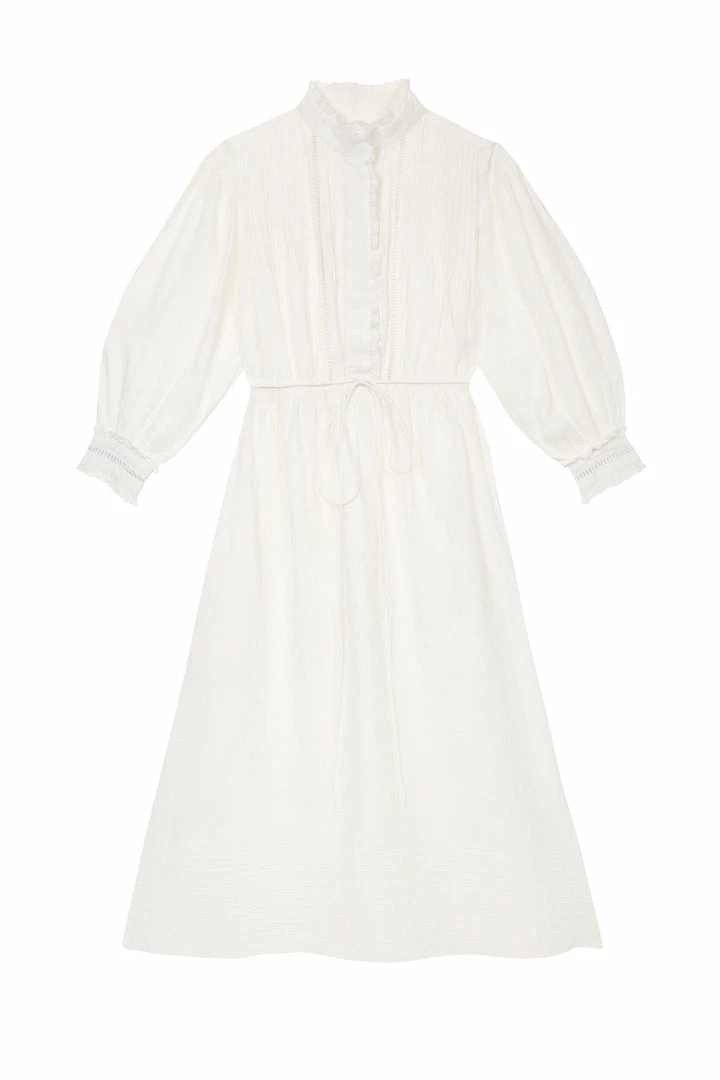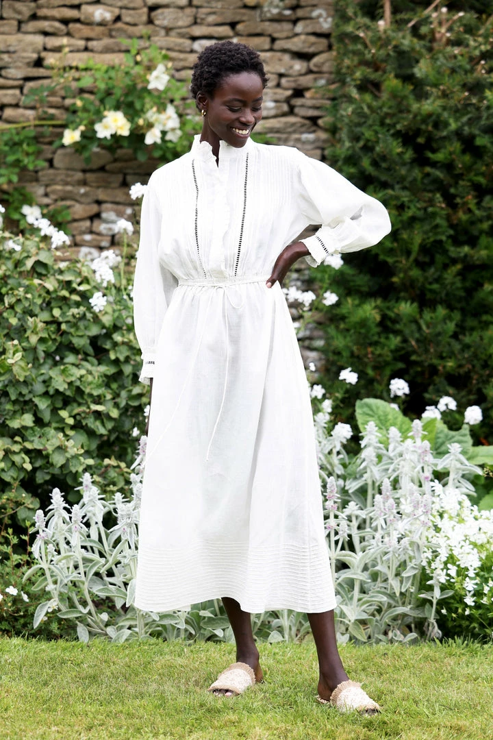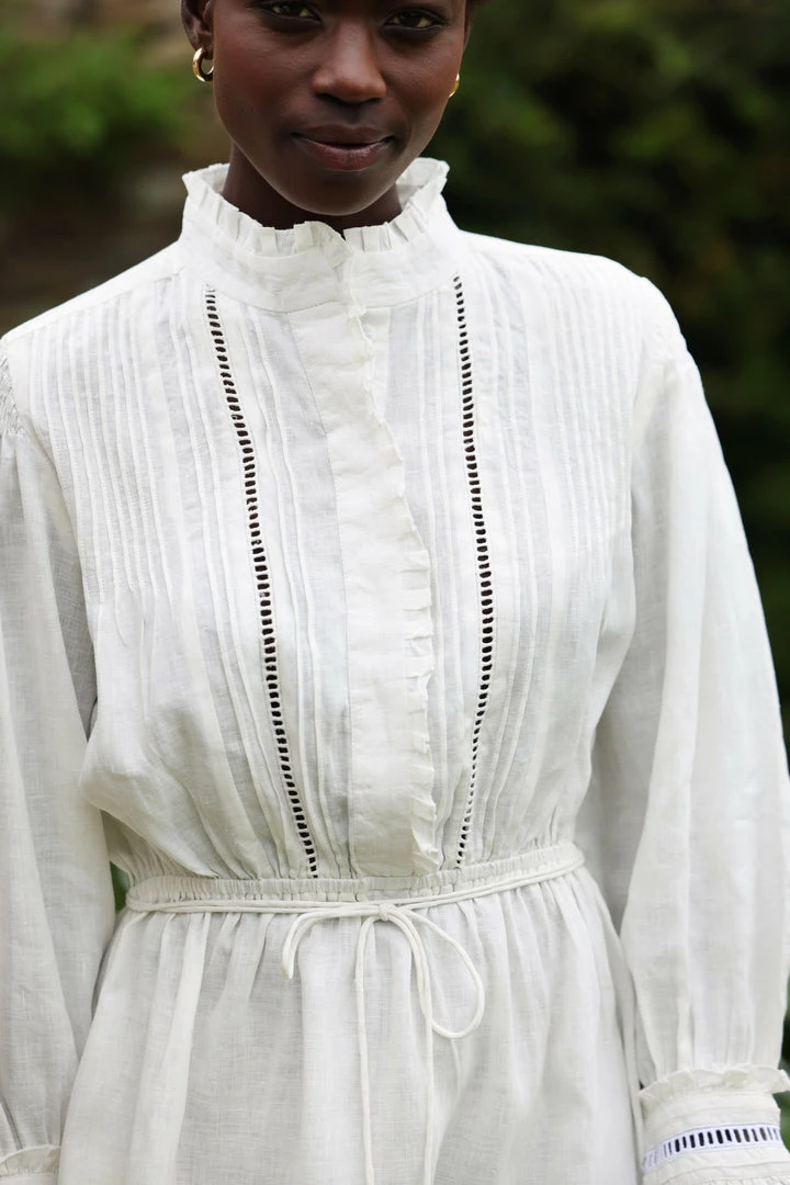 The Ladder Lace Dress Dress is cut from the softest 100% ecru linen chambray. This summer wardrobe staple has elegant frill and ladder lace details on the collar, down the front and on the cuffs. The elasticated waist and loose tie add a flattering touch and there is stylish pintucking on the hem.