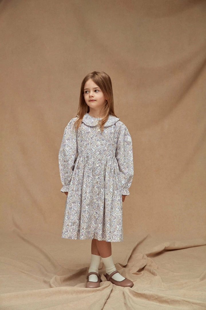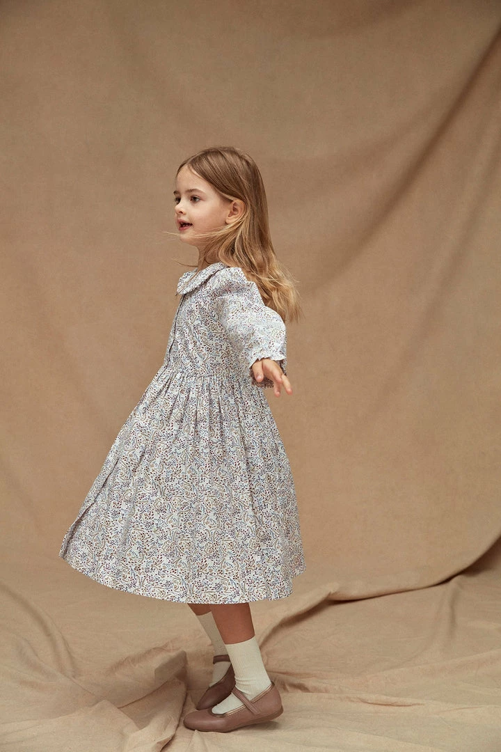 Made in a delicate blush & khaki floral print, this darling dress comes with a ruffle collar neck with front button opening, gathered waist and elasticated cuffs. Pair with either socks and shoes or tights with little ankle boots on cooler days.