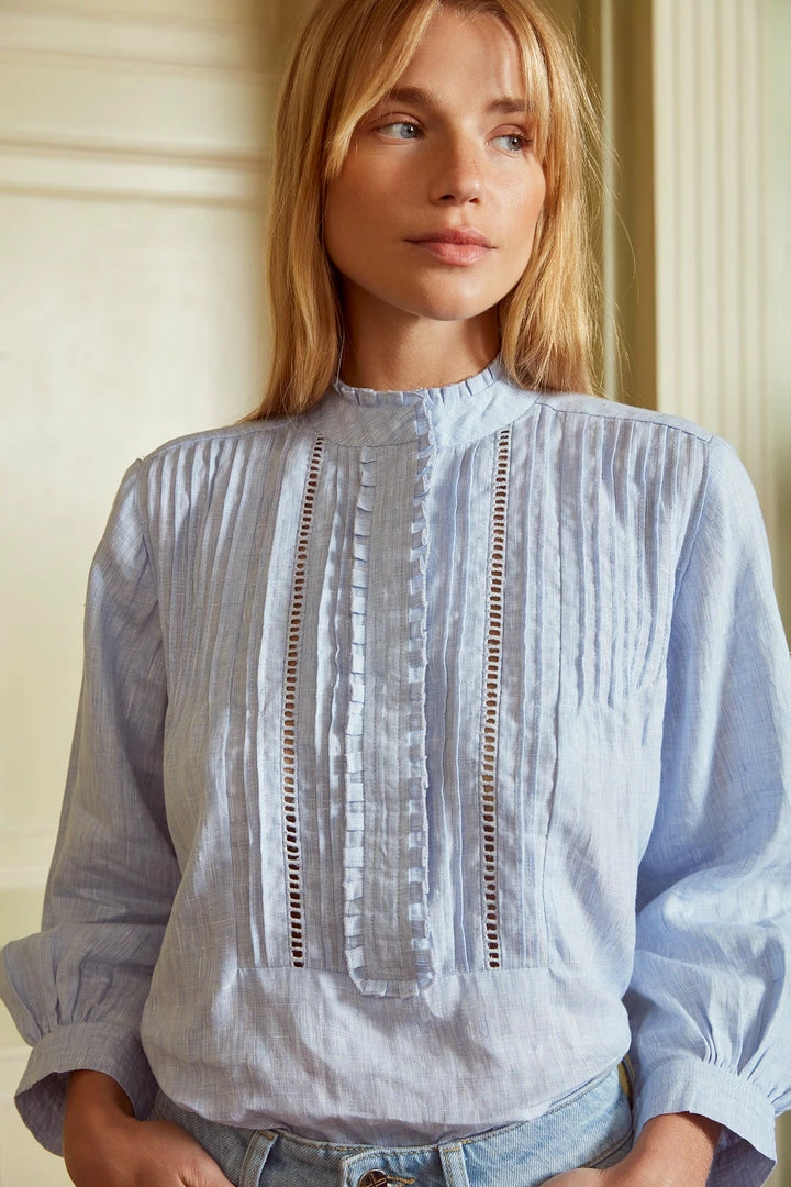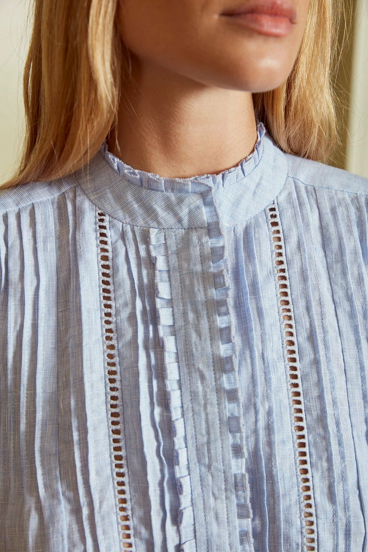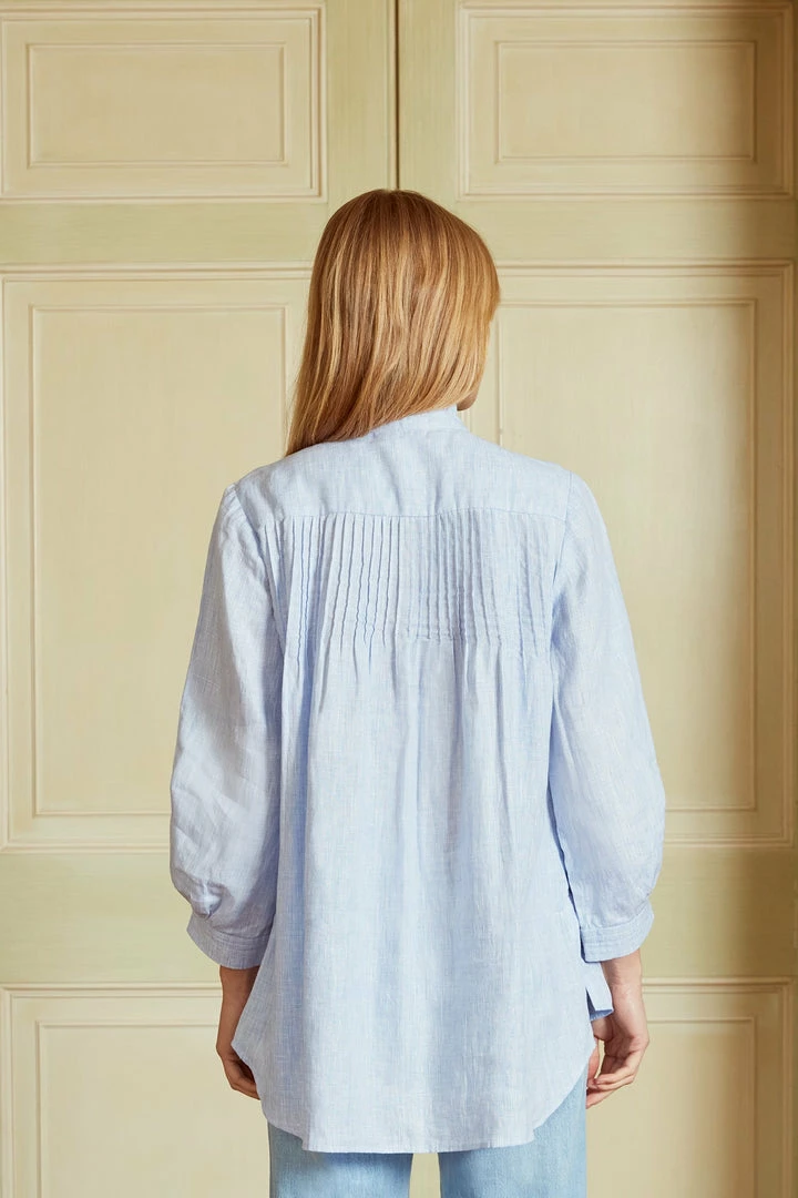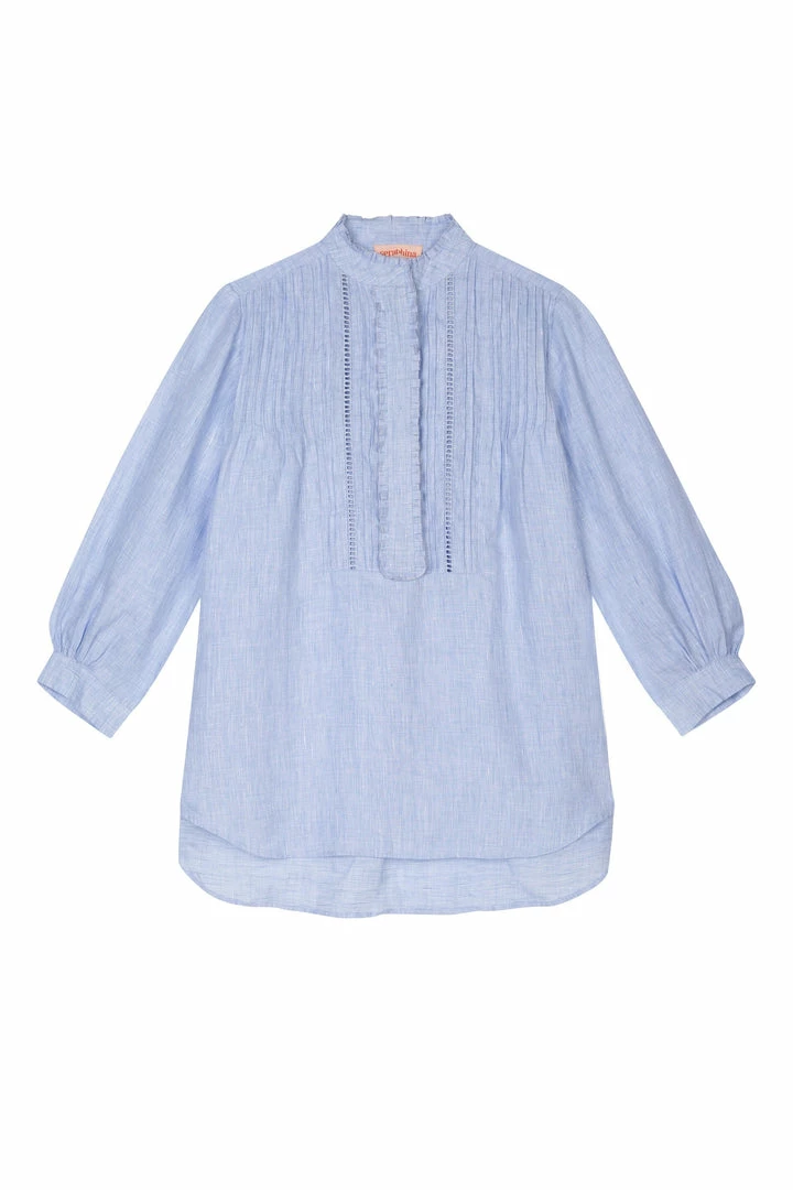 This collarless loose fitting drop hem shirt is cut from our premium milled 100% blue linen chambray. There are concealed buttons and feminine frill details on the collar. Perfect tucked into jeans or loose over shorts.Â