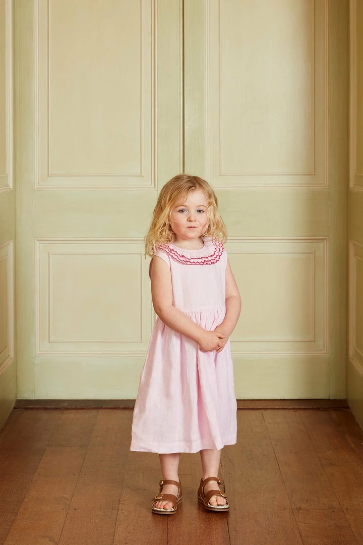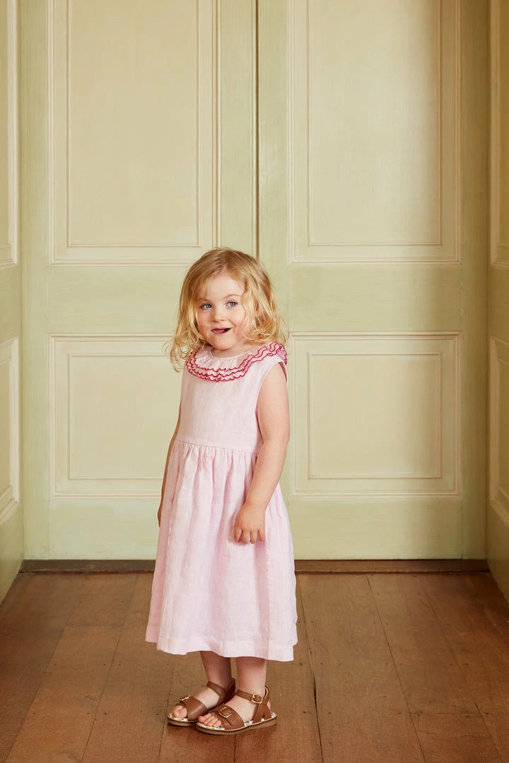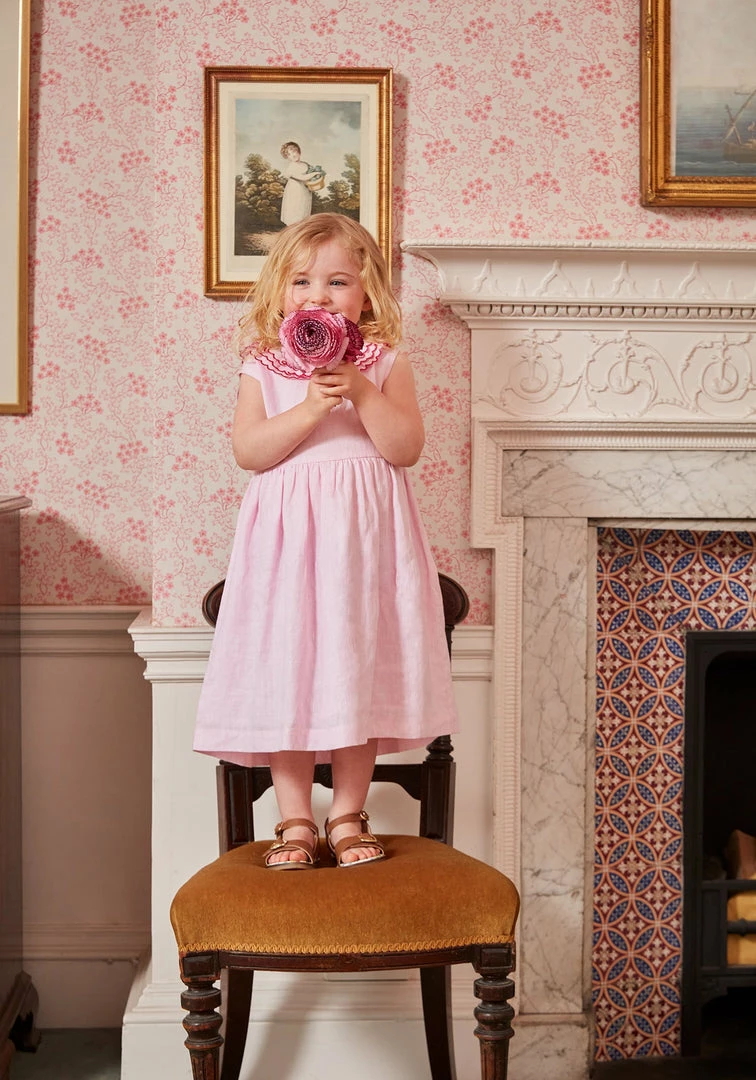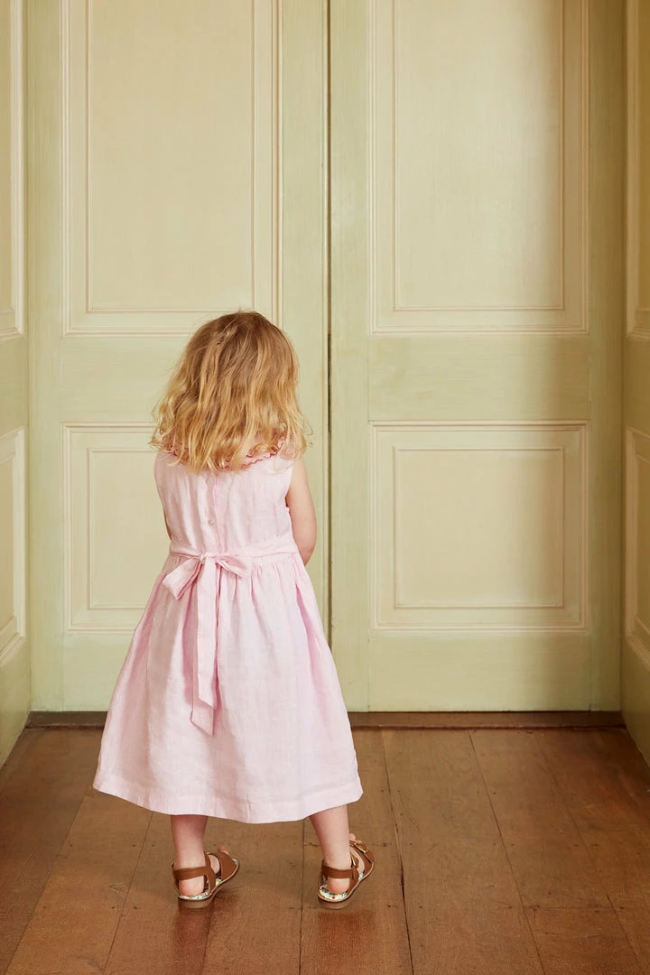 The Little Scallop Neck Dress, cut from our premium milled 100% pink linen chambray has a precious scallop detail around the neck with contrast stitching. It fastens with buttons down the back and has two waist ties. The skirt is fully lined.