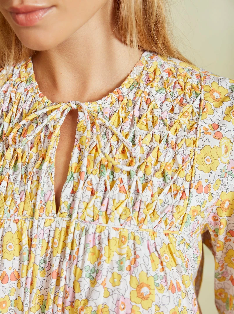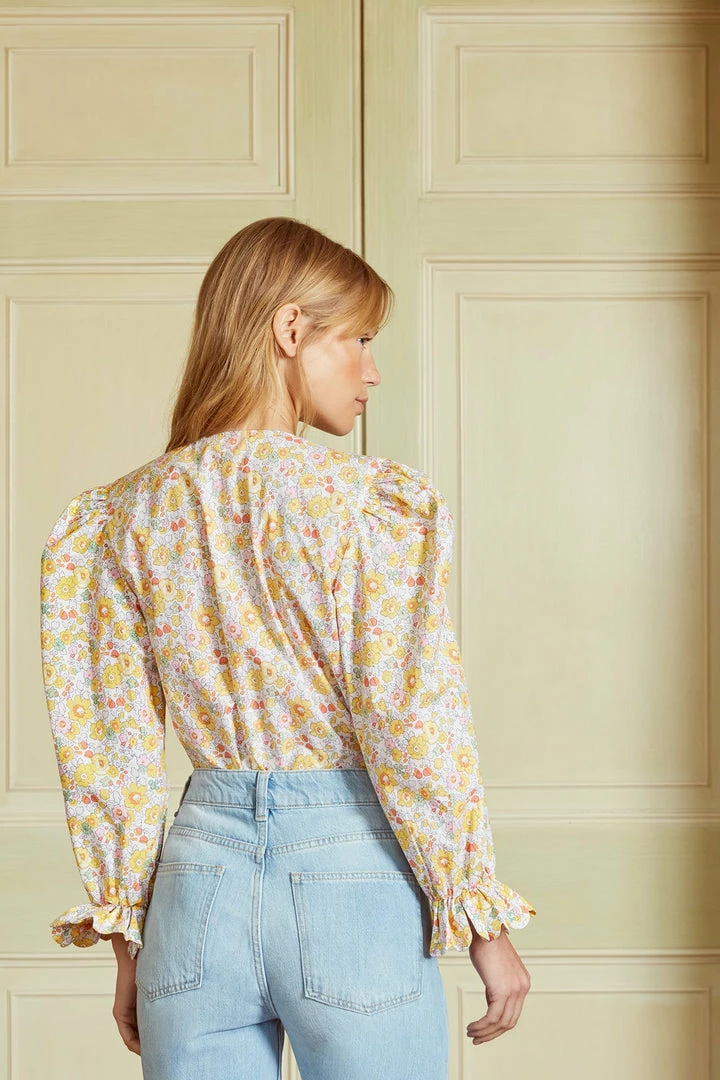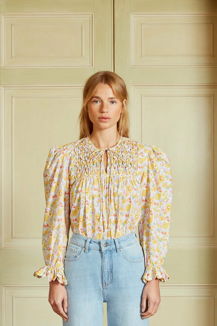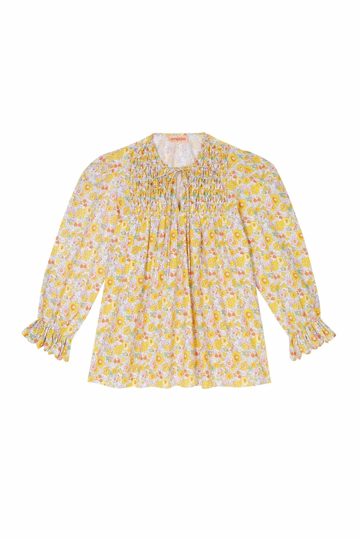 The Petal Blouse is made from 100% cotton poplin with a smocked yoke, puff sleeves with scalloped detail on the cuffs and collar. It looks fabulous tucked into jeans.