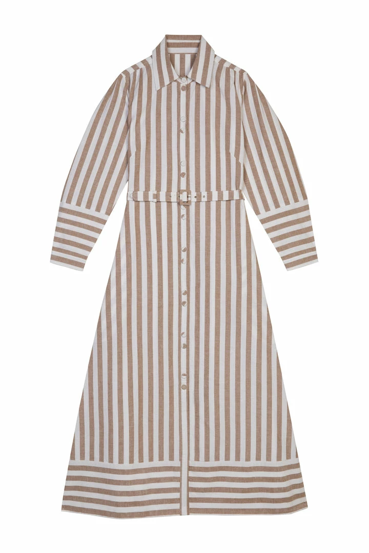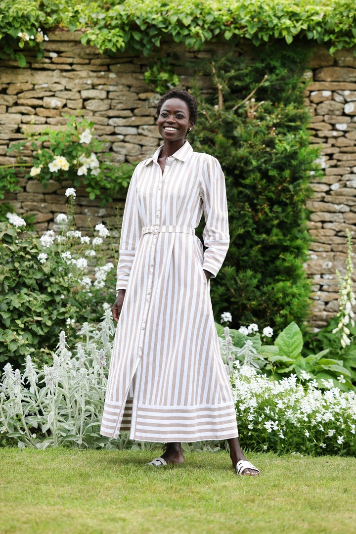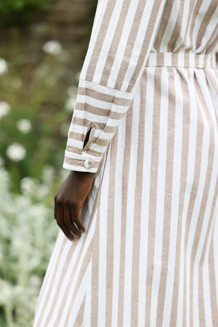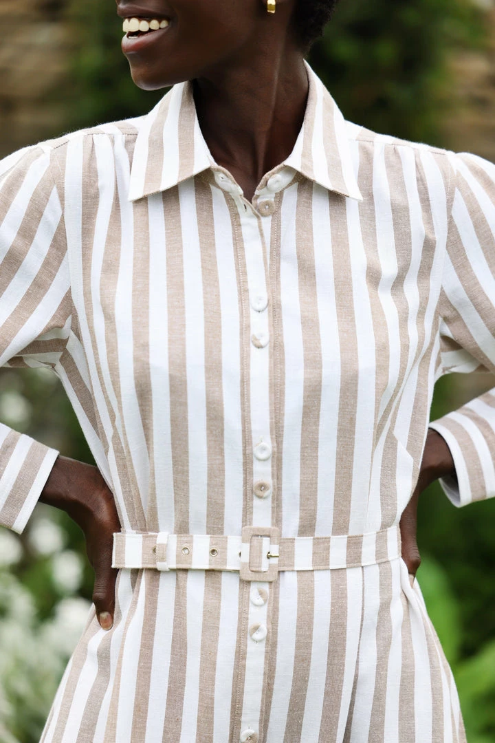A stylish shirt dress made from 100% cotton flax in stunning tan & white stripes. With buttons down the full length of the dress, a matching belt and cuffs and hem with horizontal stripes.Â