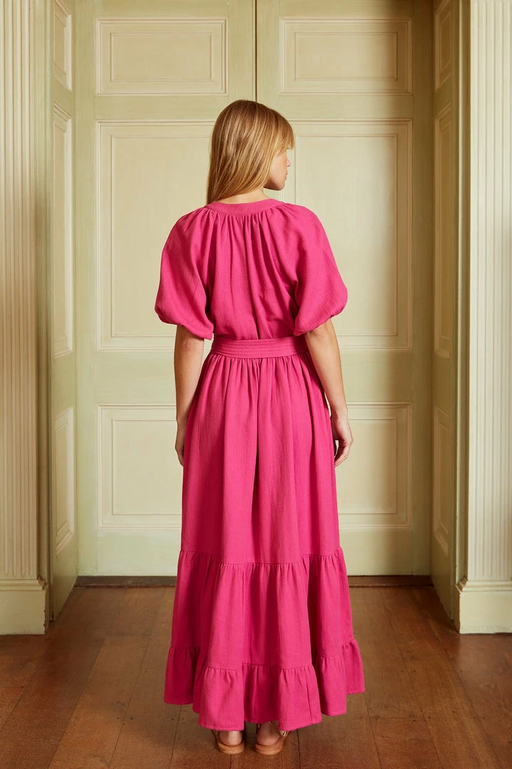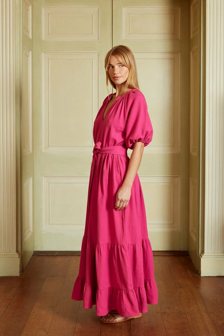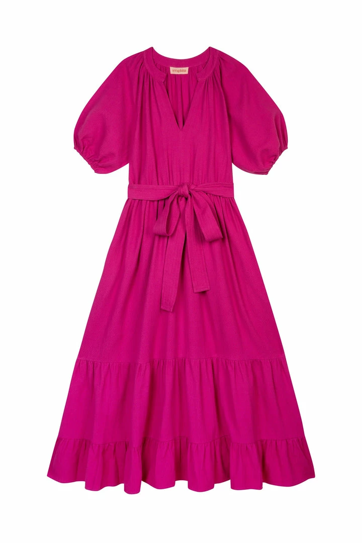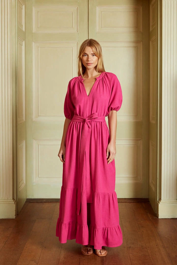 The bold and beautiful Tiered Belted Dress is cut from premium milled 100% cotton dobby and features a tiered skirt, short puff sleeves and elasticated waist with tie. Pair with sandals and it is the perfect holiday dress.