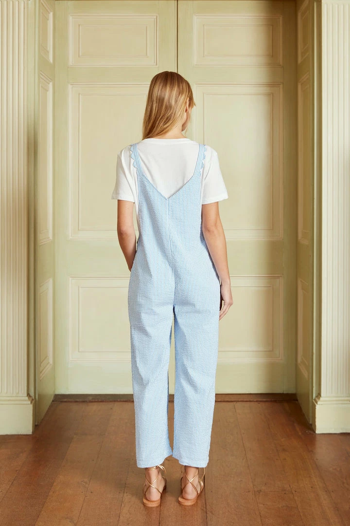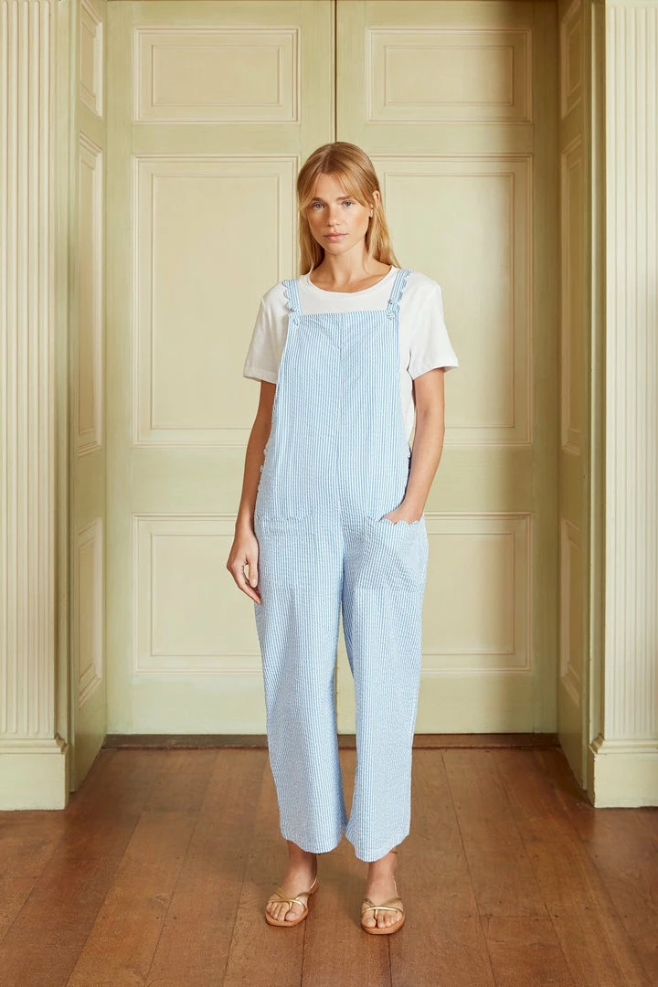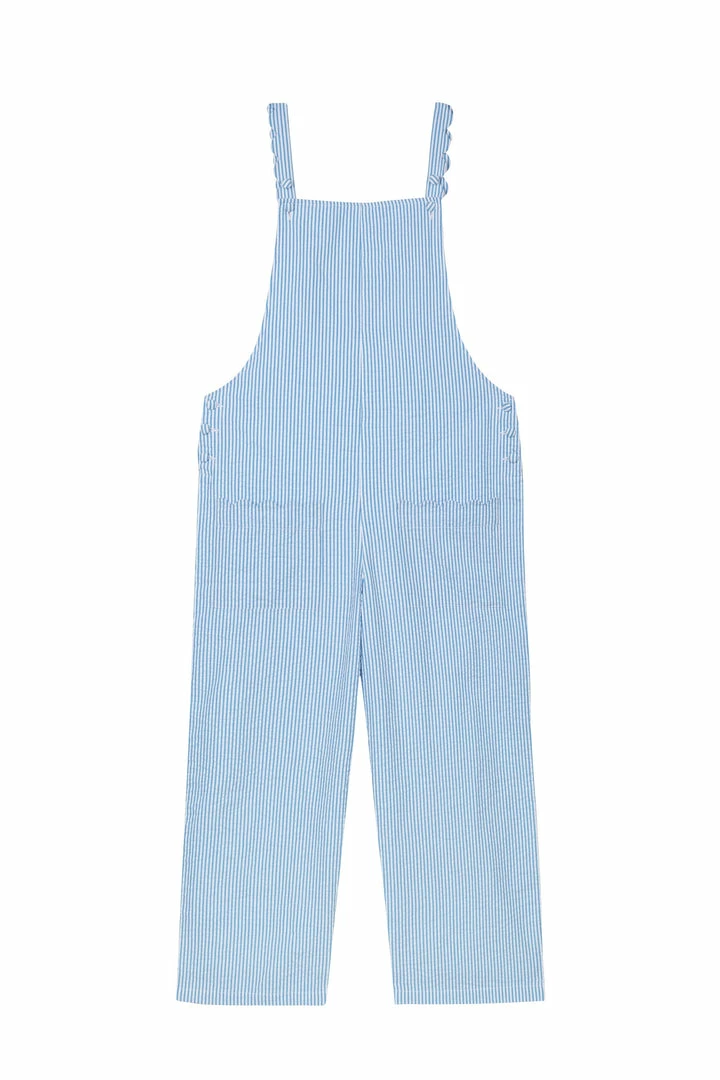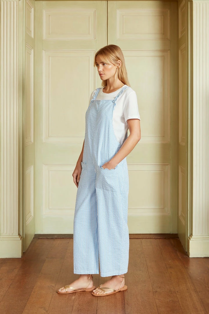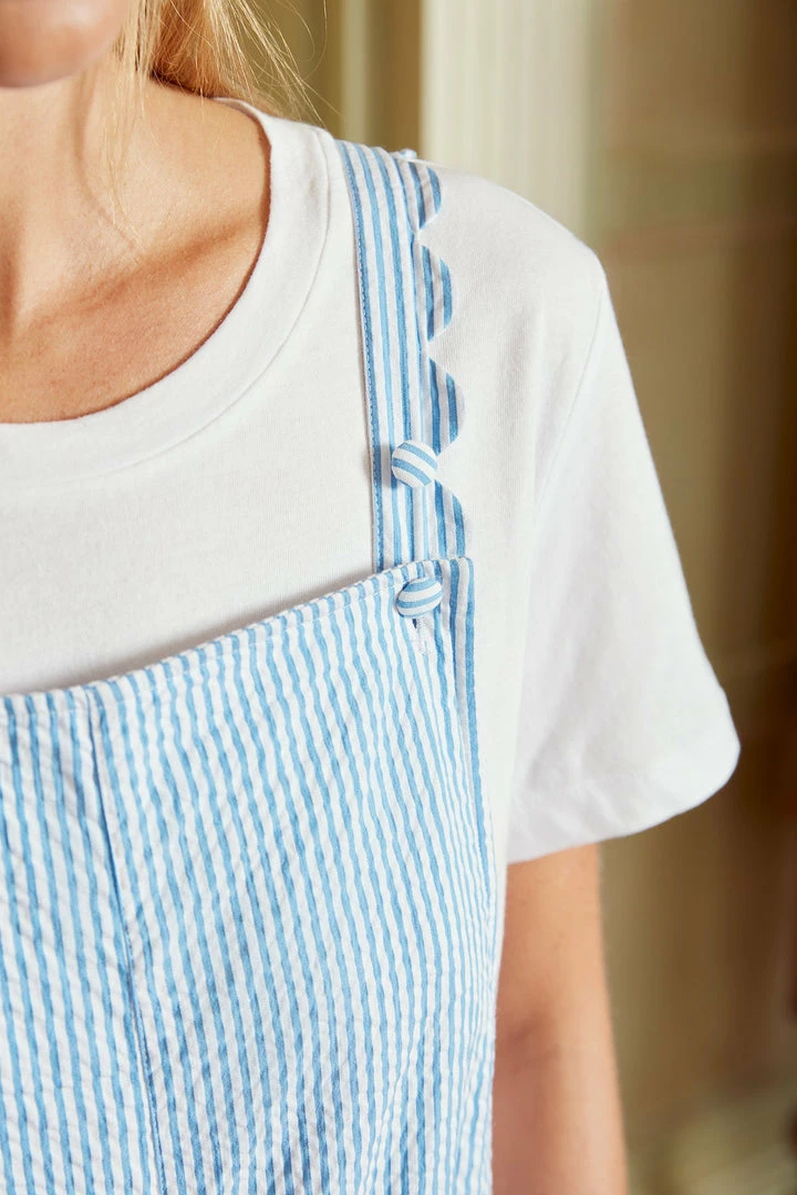 Our blue and white stripe Scallop Dungarees are made from 100% cotton seeksucker and are just heaven over a t-shirt or swimming costume. There are cute scallop details on the front pockets and adjustable straps.