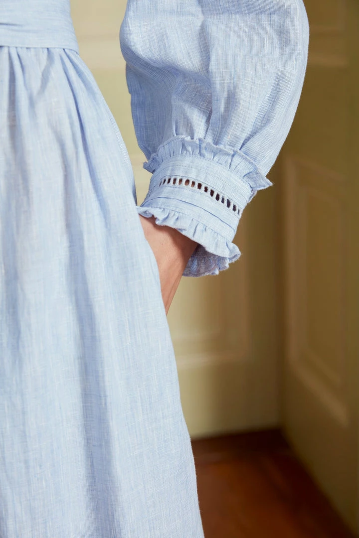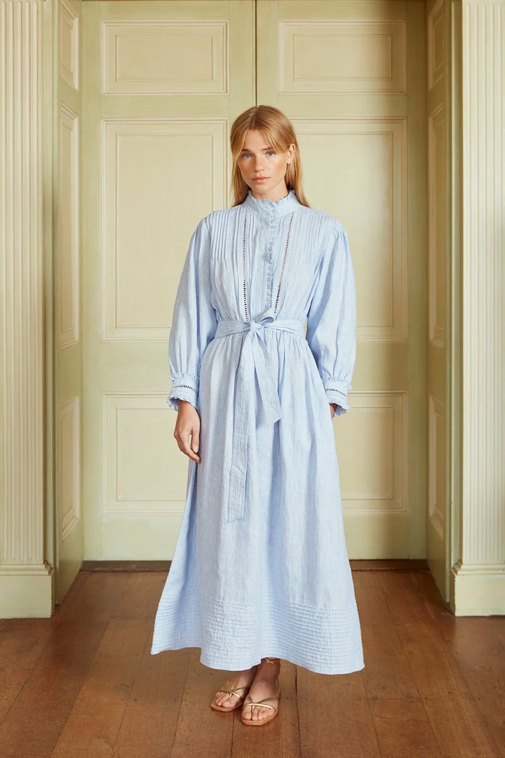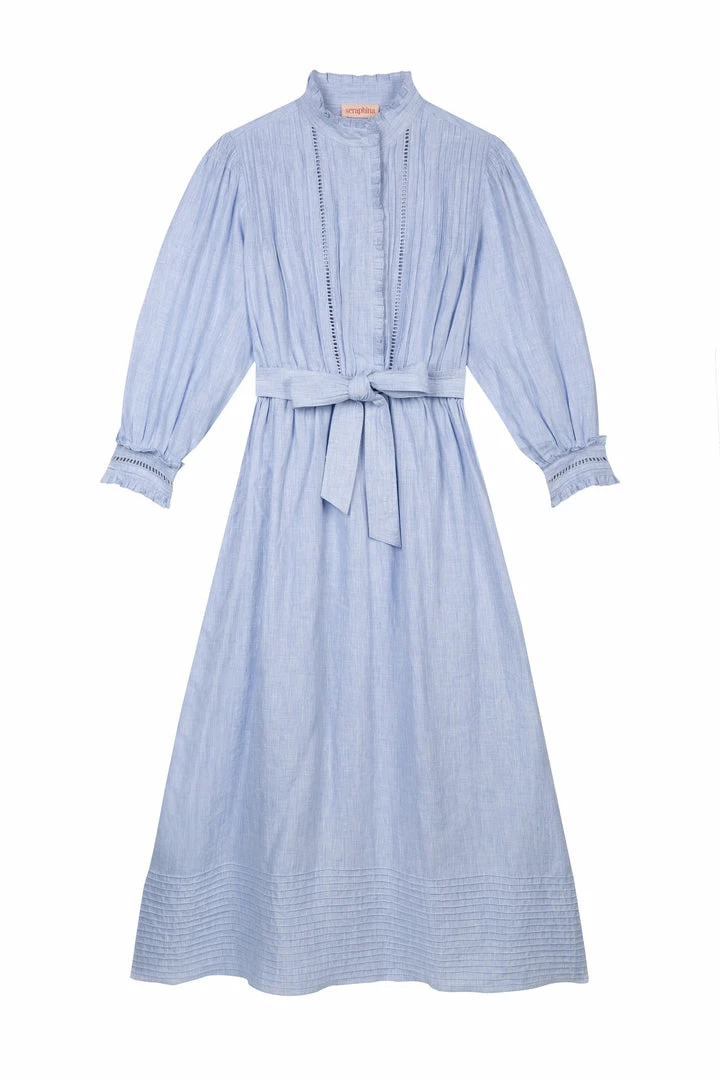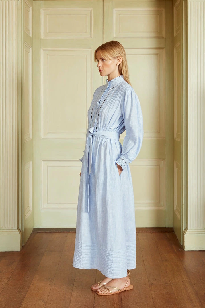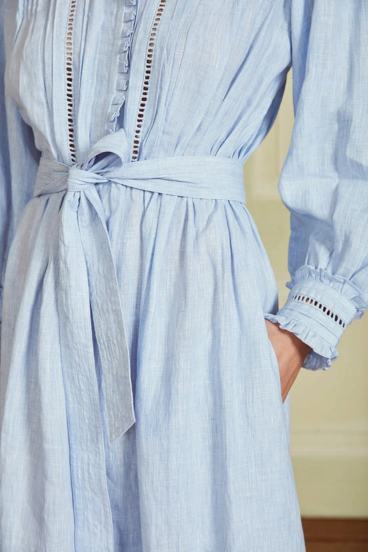 The Ladder Lace Dress Dress is cut from the softest 100% blue linen chambray. This summer wardrobe staple has elegant frill and ladder lace details on the collar, down the front and on the cuffs. The elasticated waist and loose tie add a flattering touch and there is stylish pintucking on the hem.